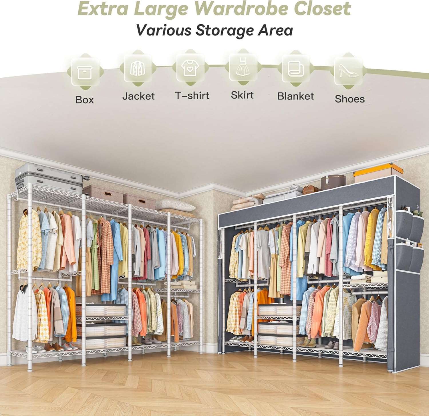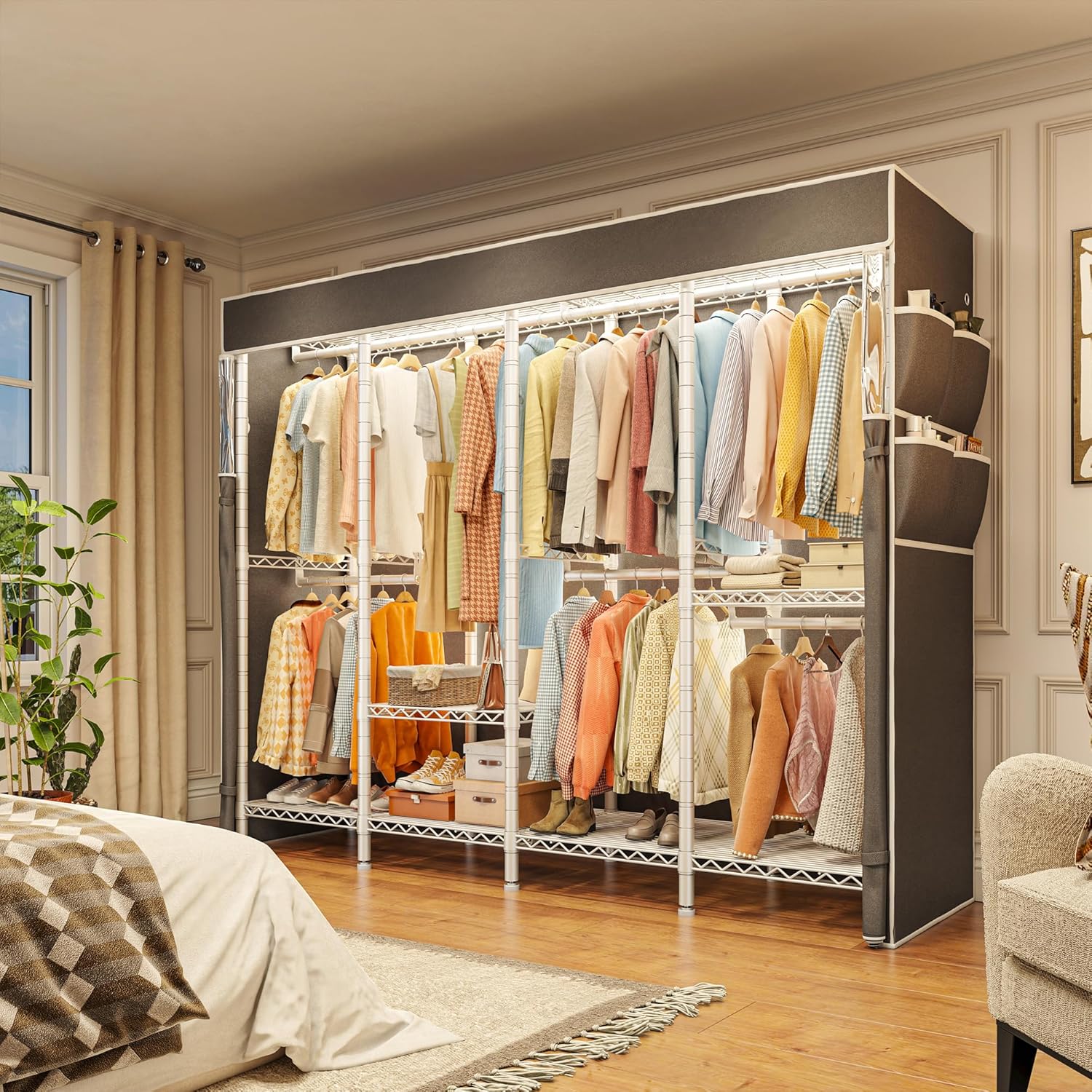 - 【Multifunction Clothes Rack】Say goodbye to messy! Our clothing racks for hanging clothes is designed to maximize your available space, providing a stylish solution to the perennial problem of clutter. 5 Hanging rods extra large clothes rack offers you various area to place your clothes, accessories, shoes, etc.
