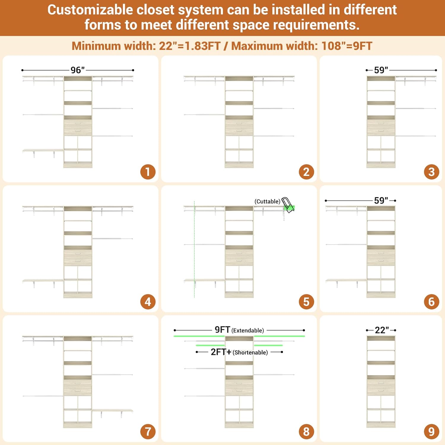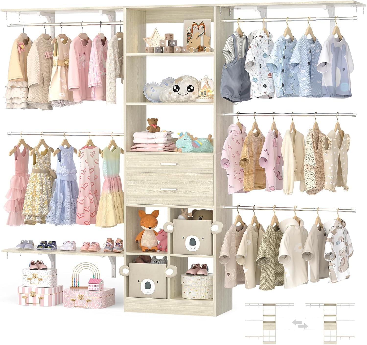 - Customizable Closet System - Besiost closet system with drawers is a valuable addition to your nursery organization and walk-in closets. The small modern closet comes with additional cuttable shelves and adjustable hanging rods, designed to fit well in nurseries of varying sizes. Width: 59"β96", Height: 80"