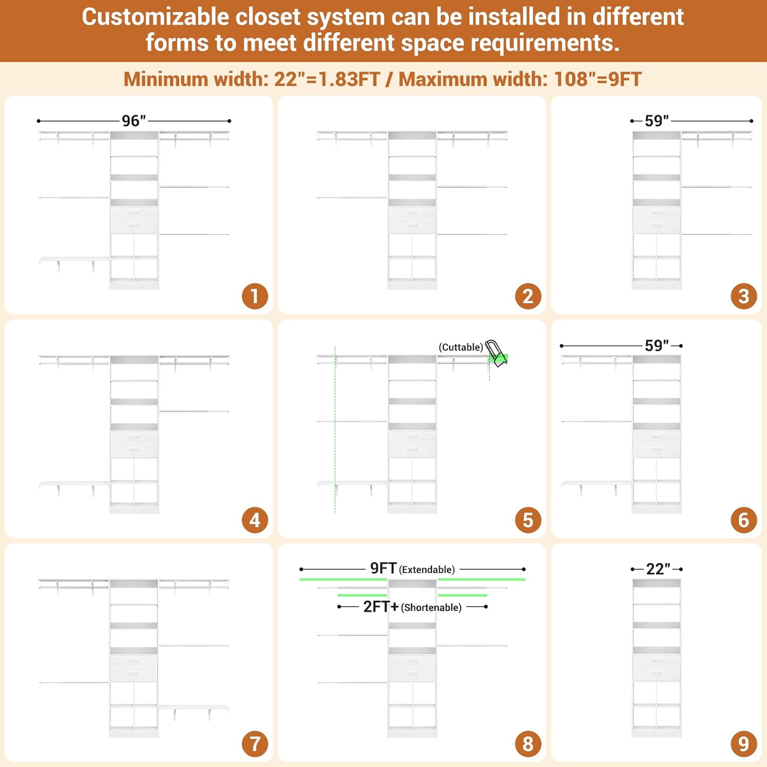 - Customizable Closet System - Besiost closet system with drawers is a valuable addition to your nursery organization and walk-in closets. The small modern closet comes with additional cuttable shelves and adjustable hanging rods, designed to fit well in nurseries of varying sizes. Width: 59"β96", Height: 80"