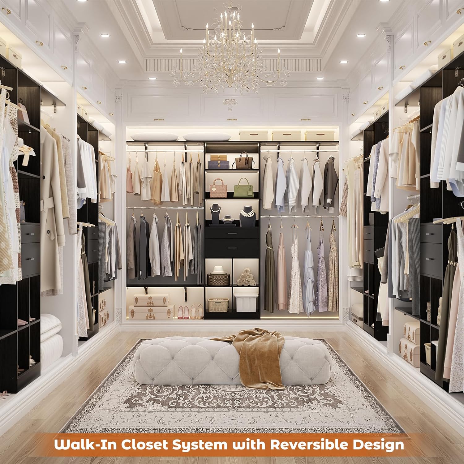 - Considerate Details - Featuring a special shallow drawer, it is easy to take or place your small items. Besides, the extra shelving and hanging robs are reversible. So you can set all the closet systems for your walk-in closet based on your usage habits.