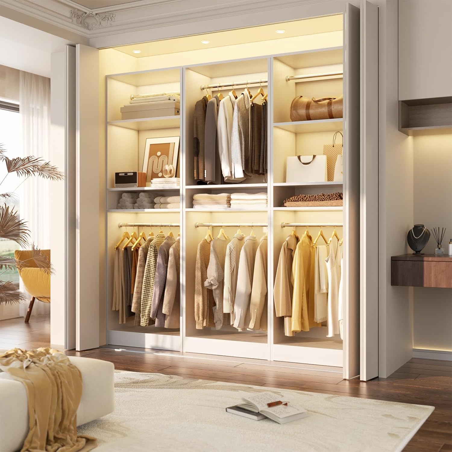 - 【Flexible and Adjustable Clothes Wardrobe】The 2 hanging rods are perfect for coat, dresses, skirts, slacks and sweaters. You can choose to use 2 hanging rods for hanging clothes, or change to use the adjustable storage shelf on the top half of the closet unit that offer plenty of open storage for folded clothes, handbags, boxes, hats or anything else. The walk in closet kit can holds up to more than 150 pieces of clothes, which make it easier to keep everything tidy and accessible.