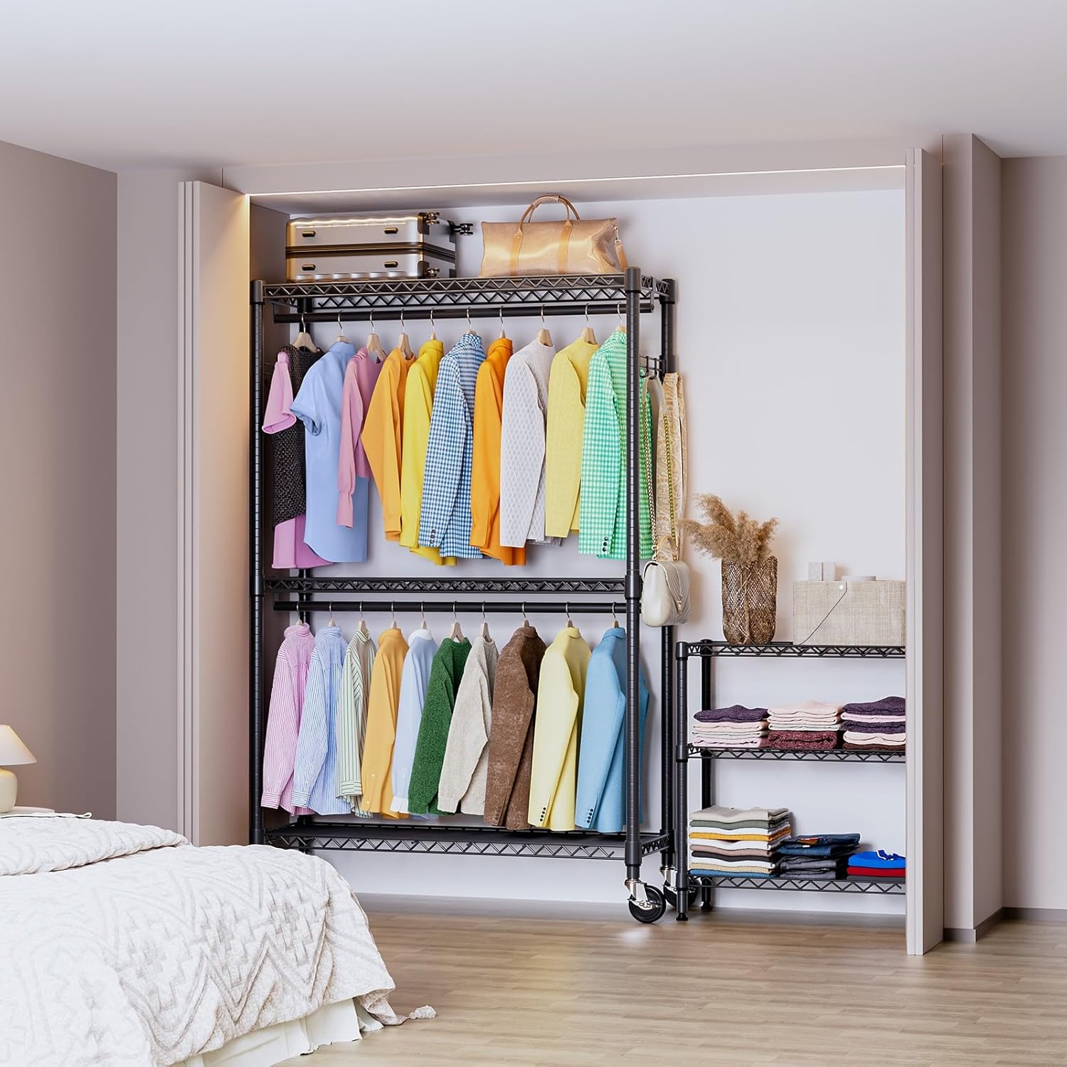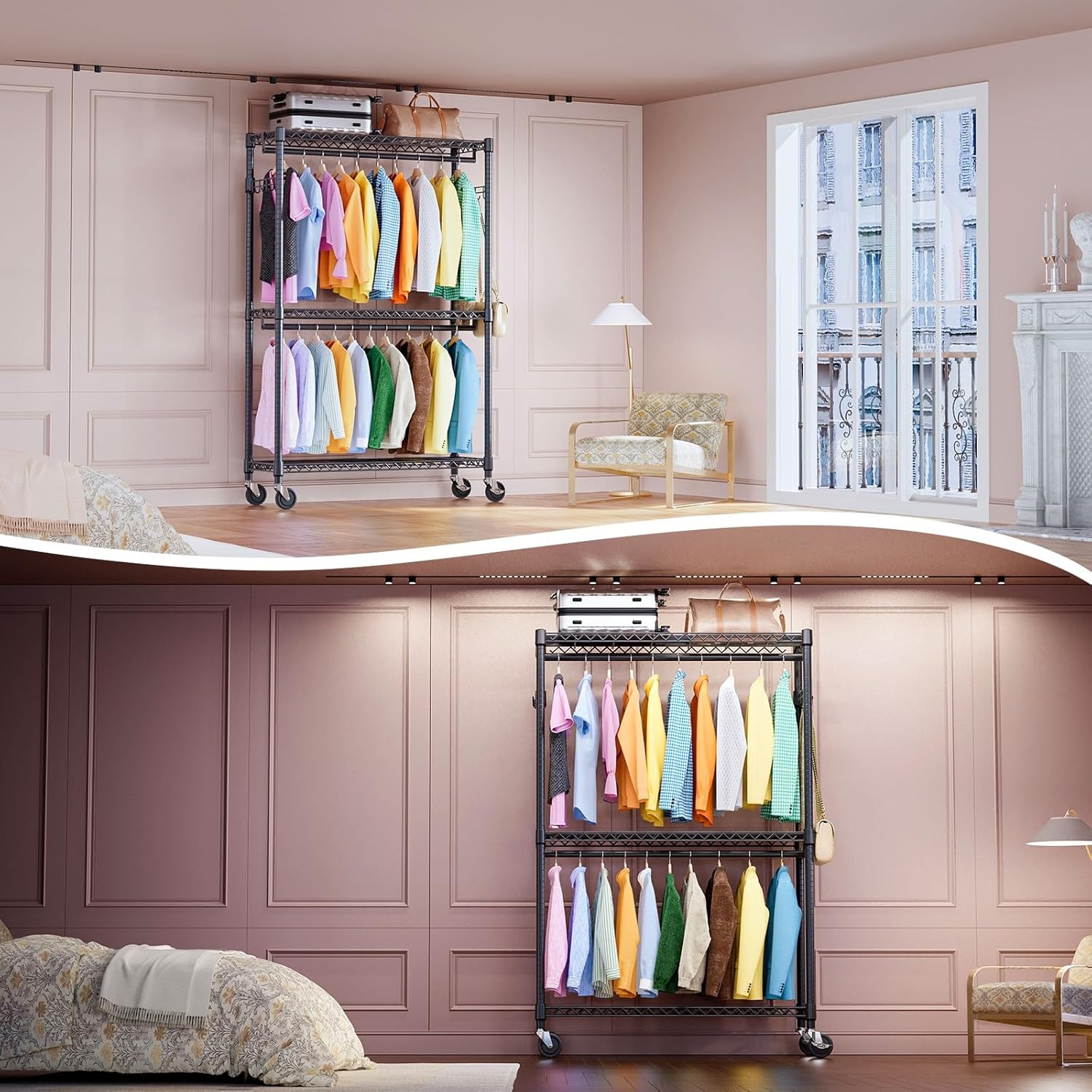 - Rotatable 360Β° Wheels And Versatile: This rolling clothes rack has 4 heavy-duty rolling wheels, and thus you can easily move anywhere you need, such as the showroom entry closet, bathroom, garage, laundry room, hallway, balcony, bedroom, cloakroom, and more. And 2 of them are lockable, which ensures more security