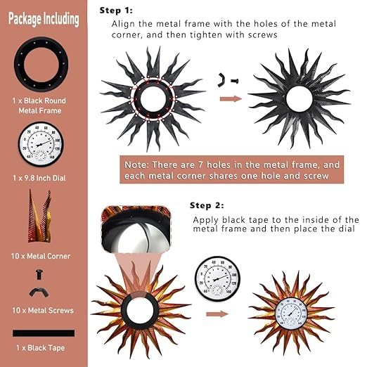 - Easy to Assemble: The sun indoor outdoor thermometer can be easily assembled without the help of tools. Match the round metal frame with the holes on the metal corners, tighten them with screws, and finally put in the 9.8-inch dial. Then hang it on the wall to decorate the room