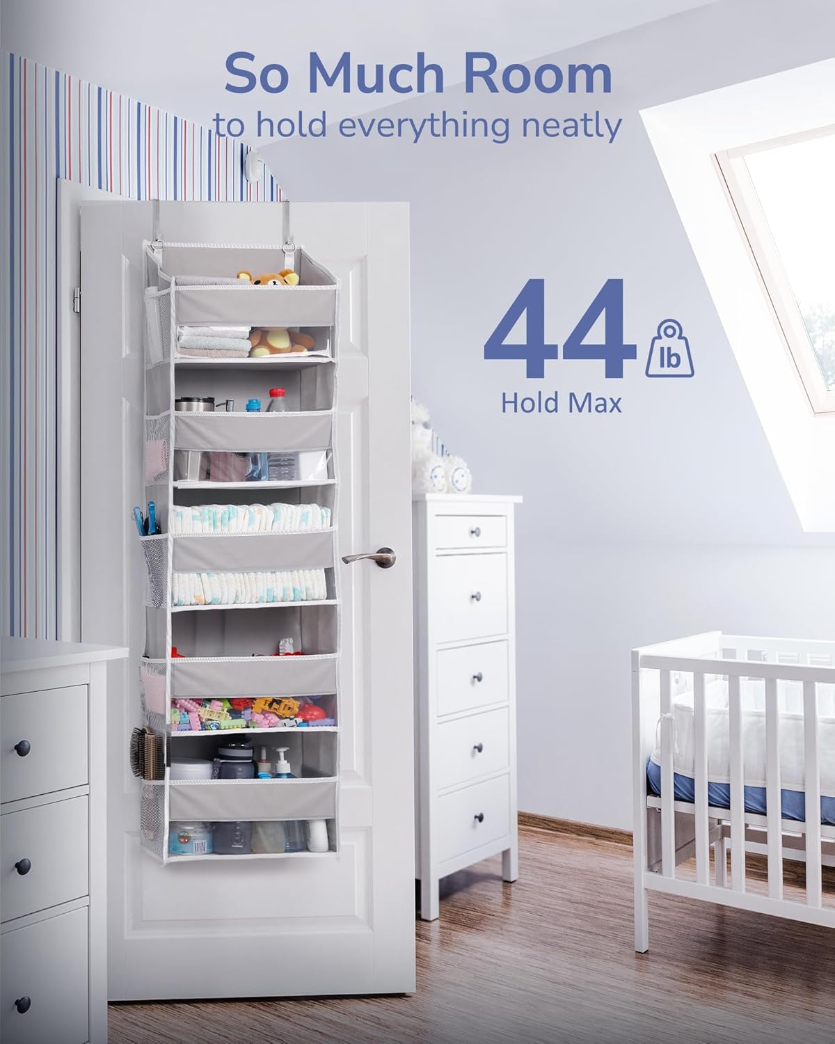 - Versatile - This baby organizers and storage is suitable for children's rooms, storage rooms, offices, laundry rooms, bedrooms, bathrooms, dormitories, etc. toys, diapers, wet wipes, baby towels, socks, etc. It is suitable for child’s room behind the door, or bedroom to store cosmetics, hair dryers, kettles, curling irons. With two provided metal hooks, the foldable organizer can be hung over a door with thickness less than 2.0in.