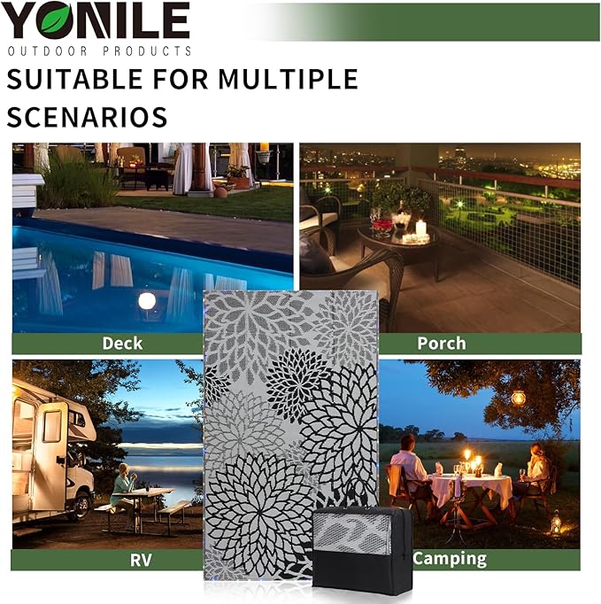 - Customer Service :YONILE outdoor rugs are suitable for patio, camper, RV road trips, camping, balcony, picnic, porch, deck and garden. Multiple sizes for your choice (5'x8', 6'x9', 8'x10', 9'x12'). If you get any problem with our rugs, please contact us immediately, we will offer you a satisfactory solution