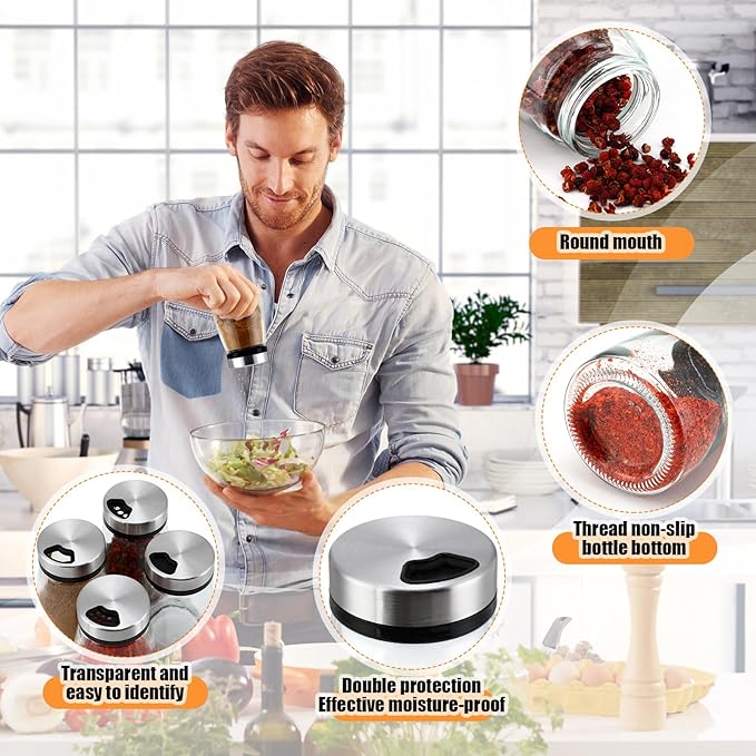 - Sturdy for Long Time Use: this salt or pepper shaker set is made of glass, which is sturdy, durable, safe, odorless and not easy to deform or fade, suitable for your long term use; Please note that if there is water on the product, please wipe it with a dry cloth, keeping the spice bottles dry can prevent the seasoning from getting damp and clumping