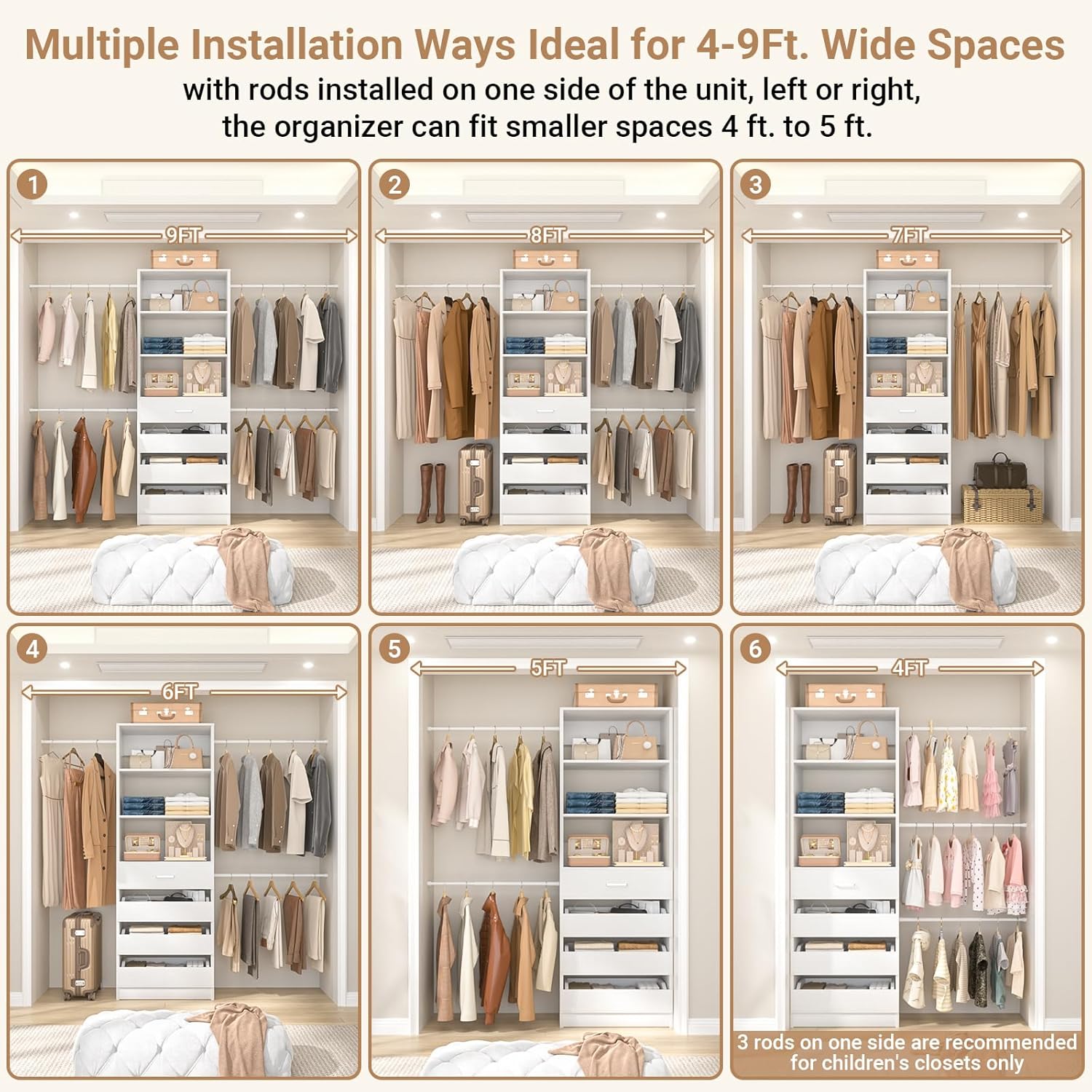 - Aheaplus Closet System, 4-9FT Closet Organizer with 4 Wooden Drawers, Wood Closet Organizer System with Tower, Walk-in Closet Organizer Wardrobe Clothes Rack with 4 Hanging Rods, Garment Rack, White