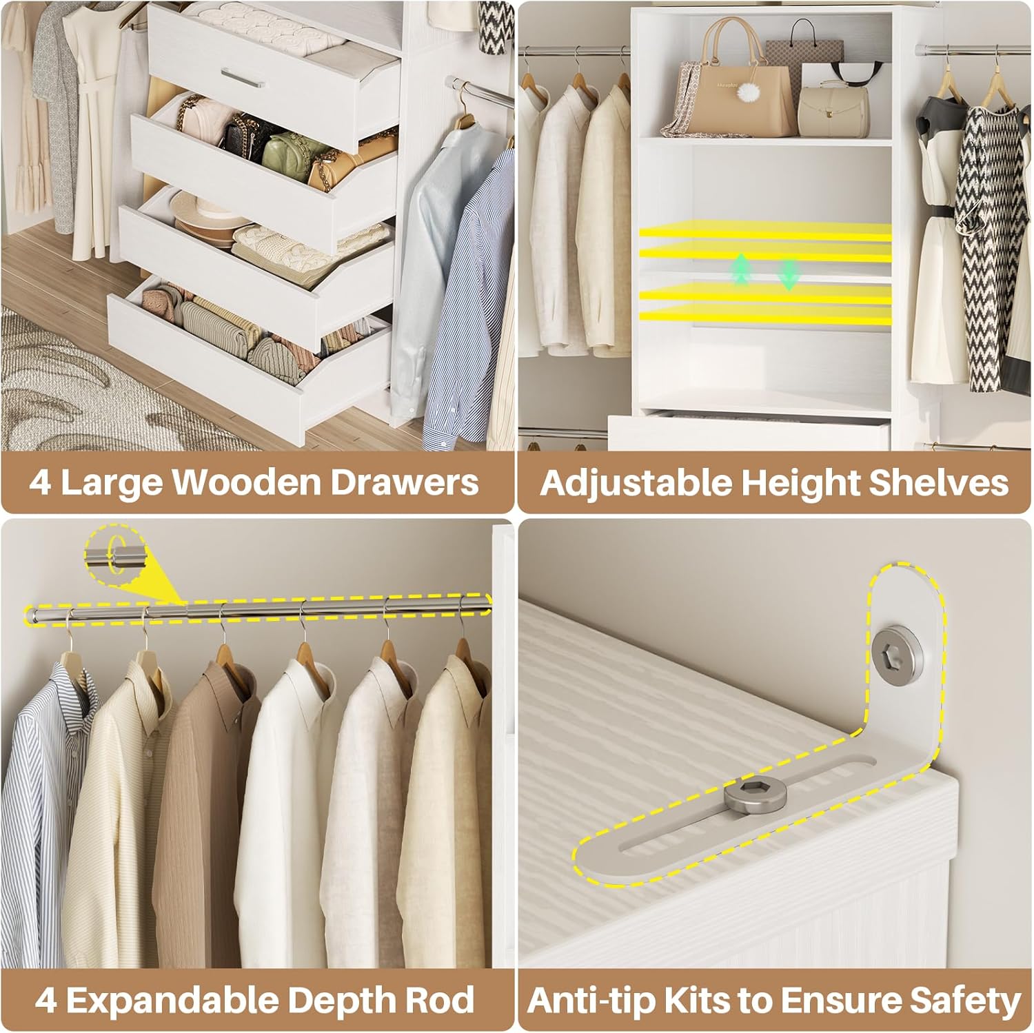 Aheaplus Closet System, 4-9Ft Closet Organizer with 4 Wooden Drawers, Wood Closet Organizer System with Tower, Walk-in Closet Organizer Wardrobe Clothes Rack with 4 Hanging Rods, Garment Rack, White