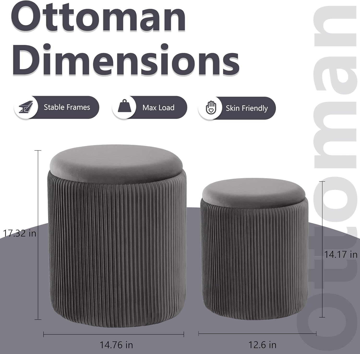 - ćPerfect Set DesignćThis round storage ottoman comes in a set of two, with the larger size measuring 14.76" x 14.76" x 17.32" and the smaller size 12.6" x 12.6" x 14.17". These two round storage ottomans can be neatly stacked together, offering a convenient space-saving solution.