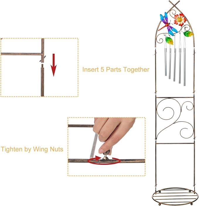 - Elegant Design: This plant pot stand features a charming back trellis for climbing plants and a robust bottom holder for flower pots. Decorated with vivid colorful dragonfly; flower and wind chime. Make it to be a beautiful and functional addition to garden