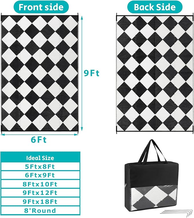 - Versatile Outdoor Carpet: The indoor outdoor plastic rugs have multiple choice in different colors(4'x6',5'x8',6'x9',8'x10',9'x12',9'x18',8'round), is ideal for a variety of indoor outdoor activities,like patio mat, deck rug, garden rug, beach mat, picnic mat, BBQ party mat, rv camping rug,pool rug,outdoor doormat,garage rug,front door mat,allowing you to have plenty of imaginable space for more fun.