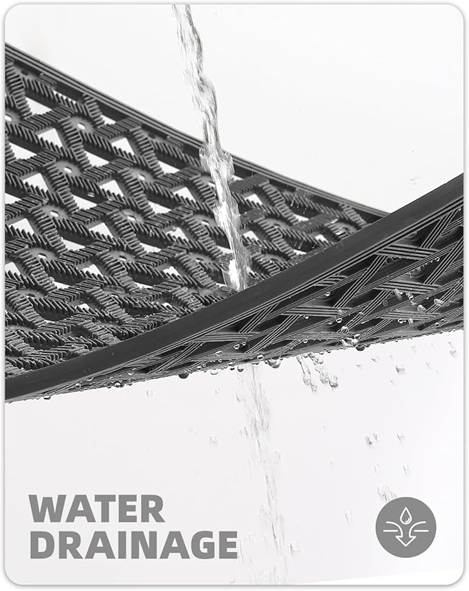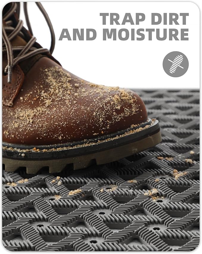 - CAPTURE DIRT & MOISTURE: Our front door mat is designed with deep grooves and a beveled rubber border, creating a powerful barrier against dirt, mud, debris, and moisture; The innovative retention dam ensures that all unwanted elements are captured and contained, so your floors stay clean and dry