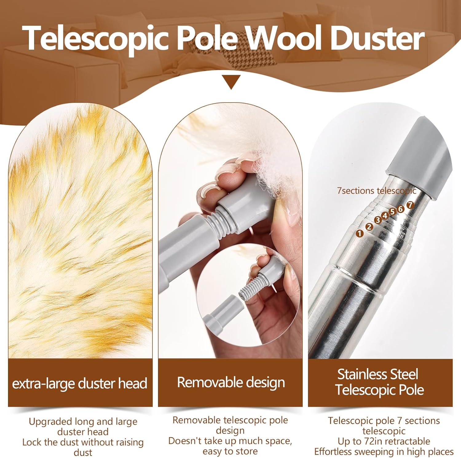 - HIGH QUALITY LAMBWOOLS FEATHER DUSTER: Stainless steel telescopic pole design easily sweeps away dust from high places, making roof cleaning simple! Screw-type detachable design, easy to connect, longer service life, easy to store and save space