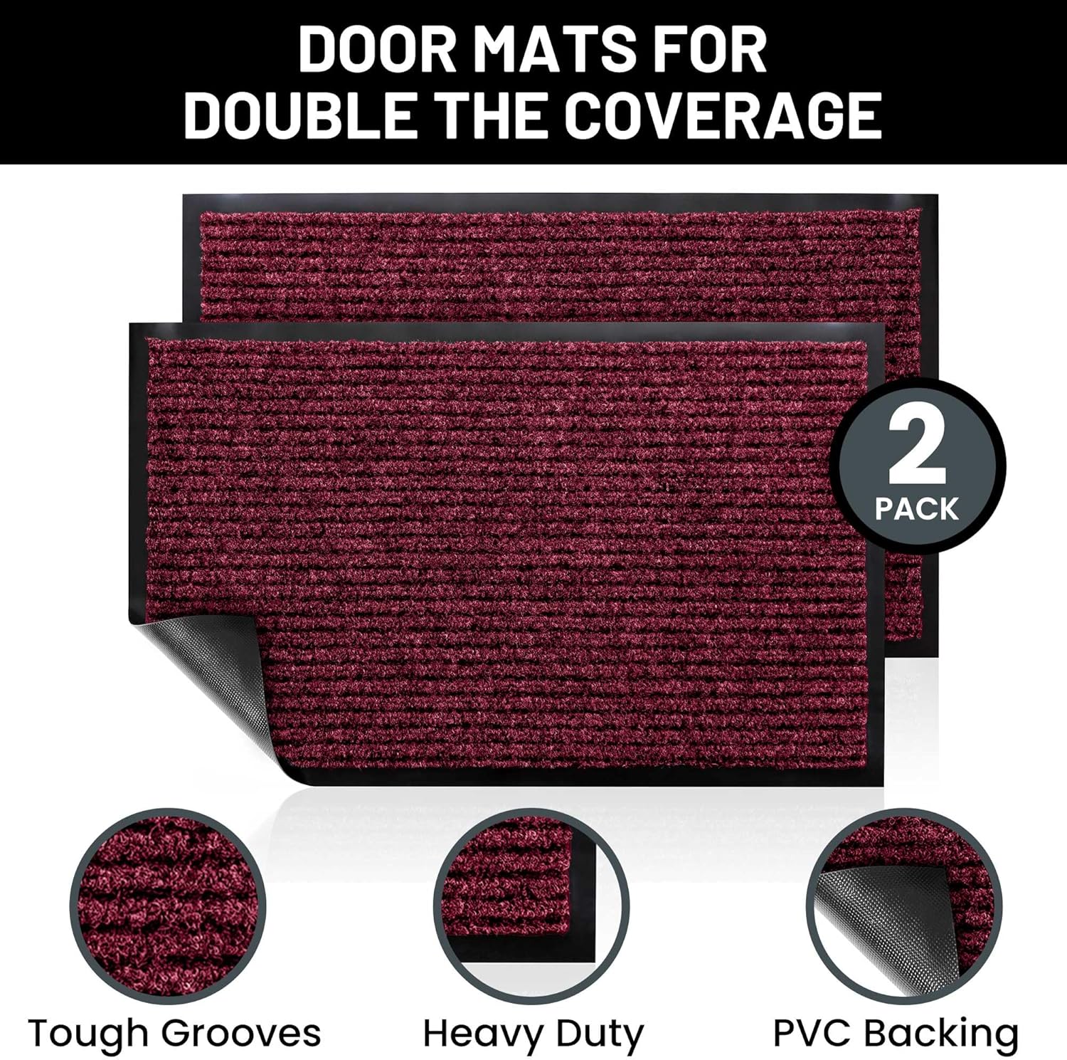- Includes 2 RED X-Large Indoor Outdoor Floor Mats: Enjoy two amazing heavy duty high quality ribbed polyester door mats (Larger 48" x 36") that will be perfect welcome for the everyday home. Amazing value 2-Pack.