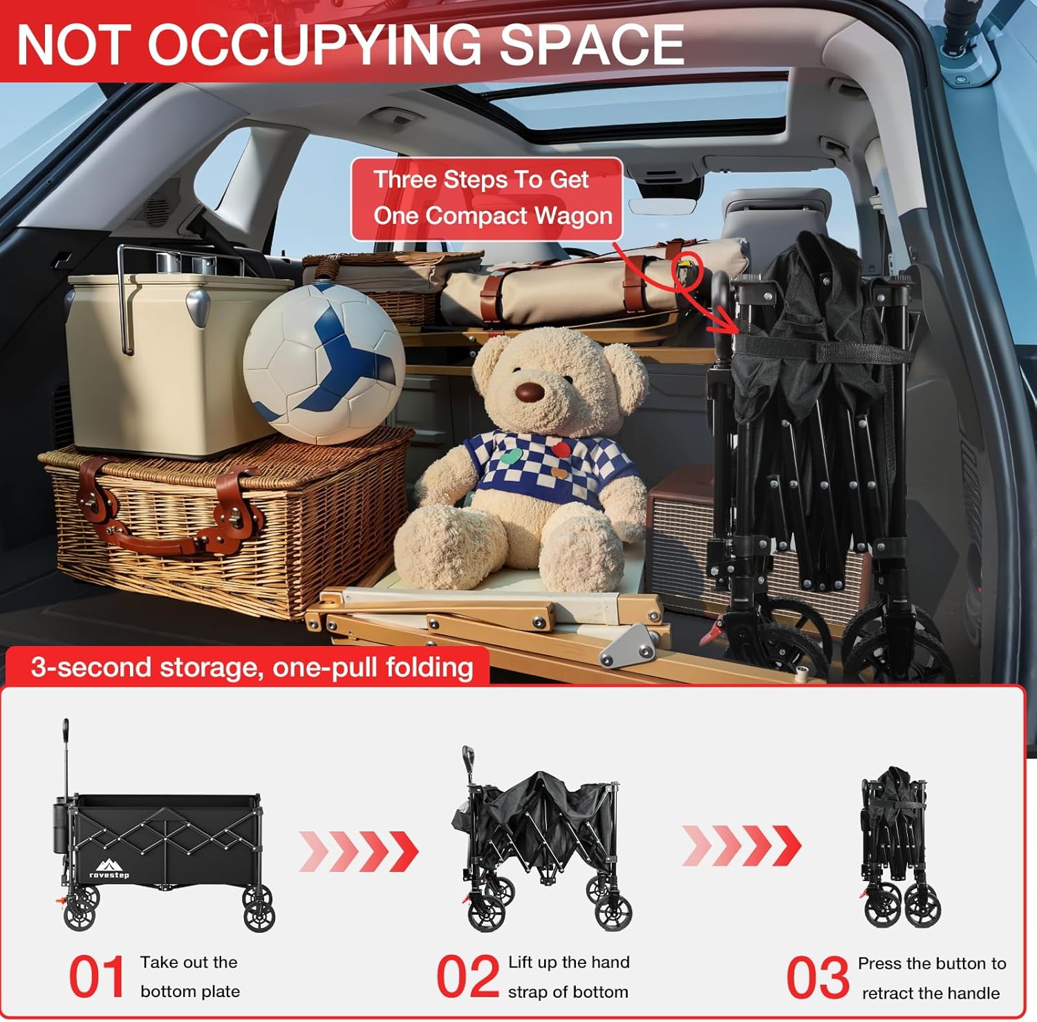 - All-Terrain Large Wheels:Equipped with large, all-terrain wheels, this collapsible wagon rolls smoothly over sand, gravel, dirt, and grass, providing effortless maneuverability for beach trips, camping, shopping, and outdoor adventures.