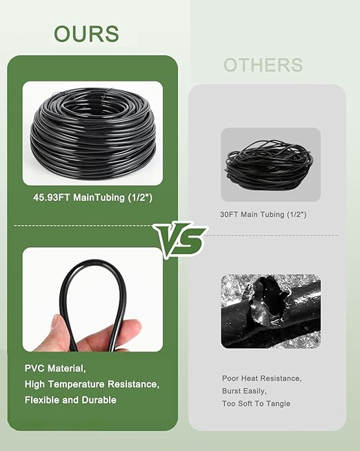 - 🌱 Reliable Water Supply for Your Entire Garden: This upgraded irrigation system connects directly to your water source via a female coupler and uses 1/2" tubing as the main line, branching out with 1/4" tubing to cover a wider area. The system supports up to 20 drip emitters, ensuring that all your plants—near or far—receive consistent and adequate hydration.