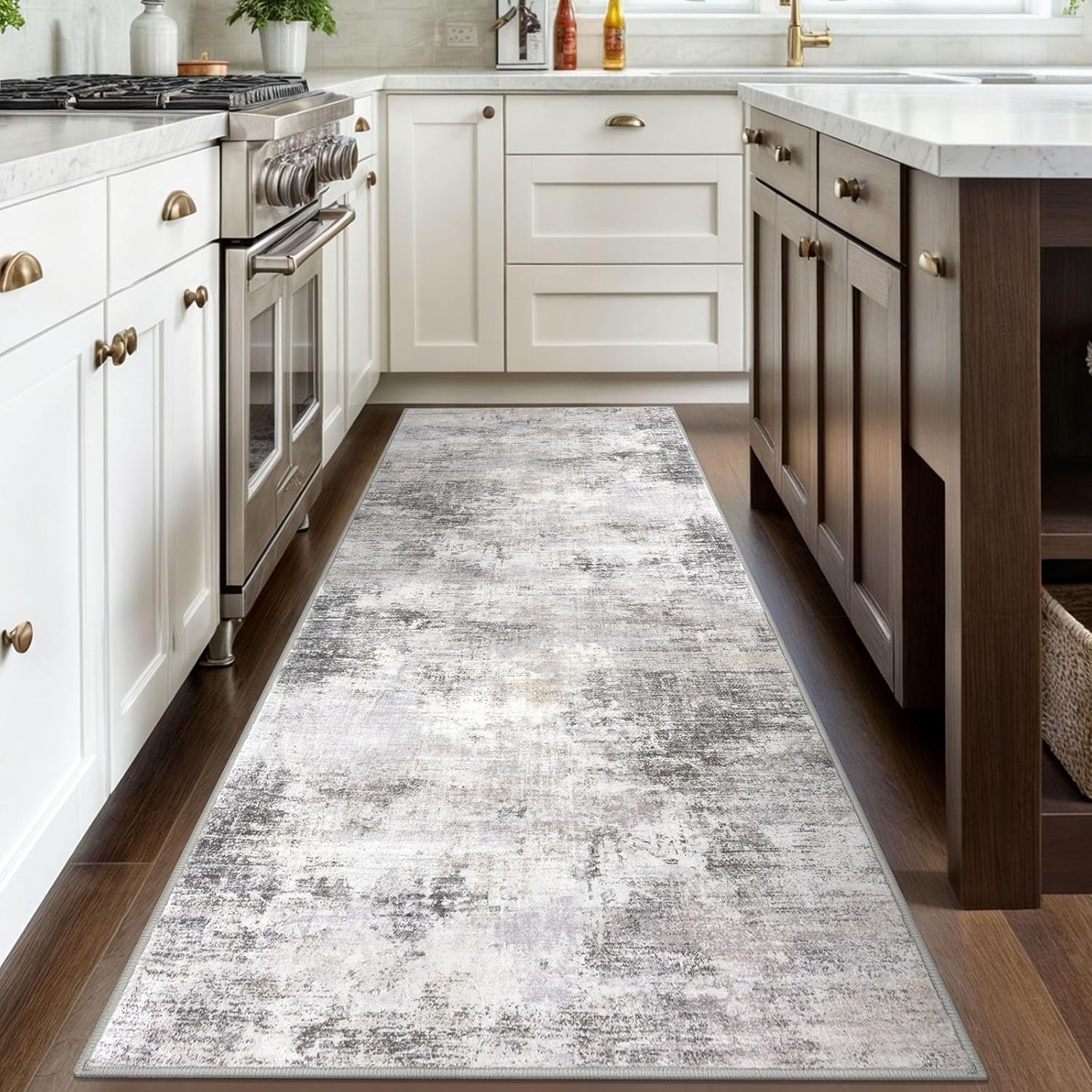 IOHOUZE Abstract Runner Rug 3x8 Ft Washable Runners for Hallways, Non Slip Kitchen Runner Printed Faux Wool Entryway Runner Indoor, Modern Abstract Floor Carpet for Hall Bedroom, Grey Beige