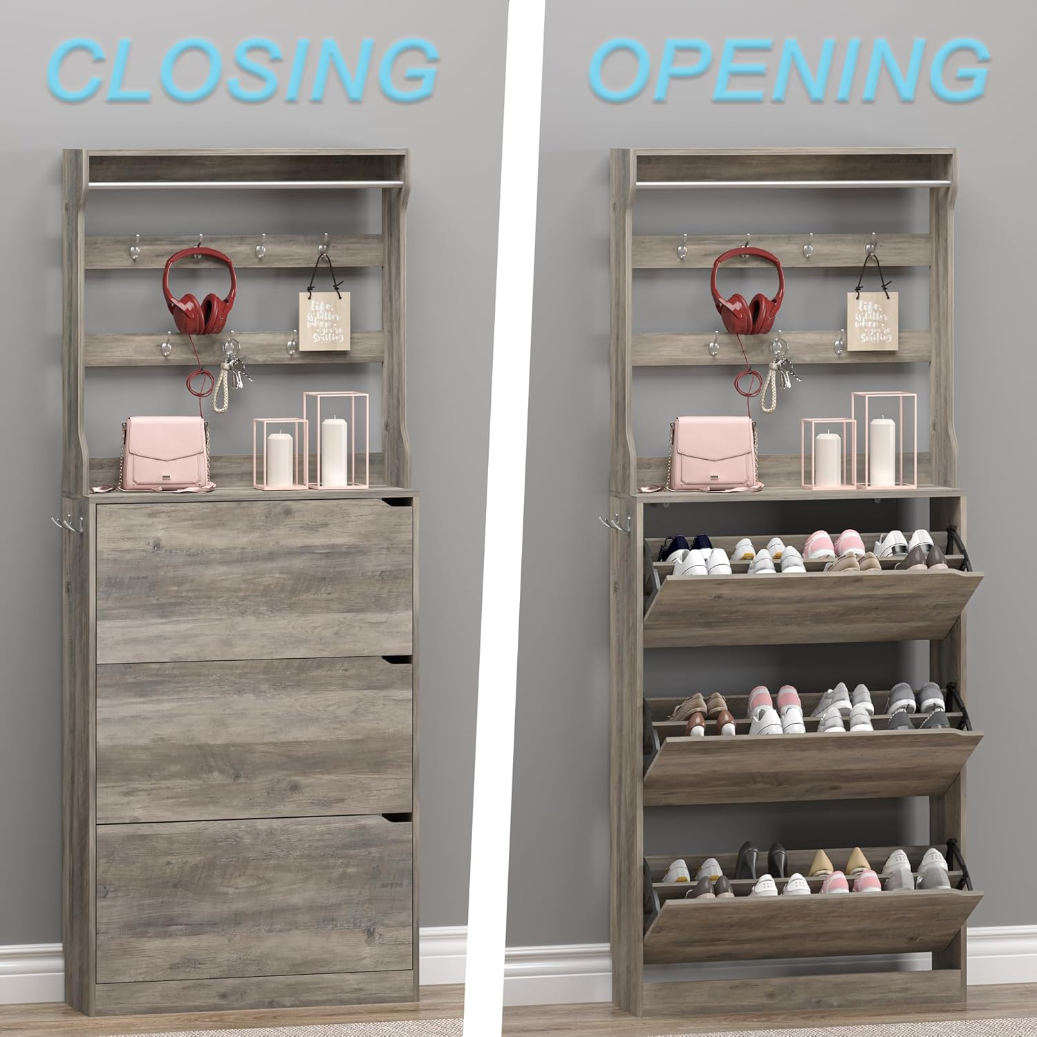 - 【2-in-1 Hall Tree & Shoe Cabinet】This upgraded shoe cabinet now includes a multifunctional design that combines a coat rack and shoe storage in one. Ideal for organizing shoes, coats, hats, and other accessories in your entryway, hallway, or living room, making your space neat and efficient.