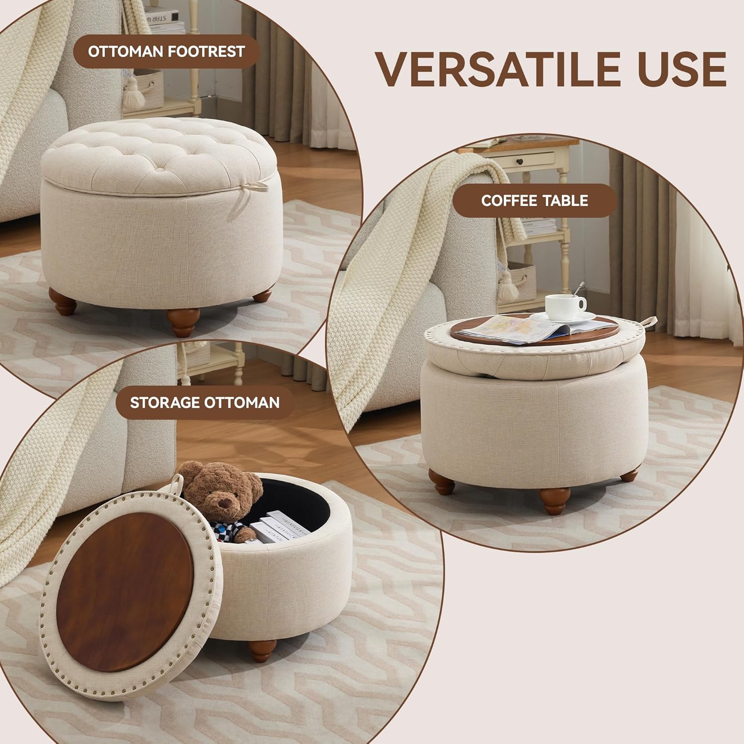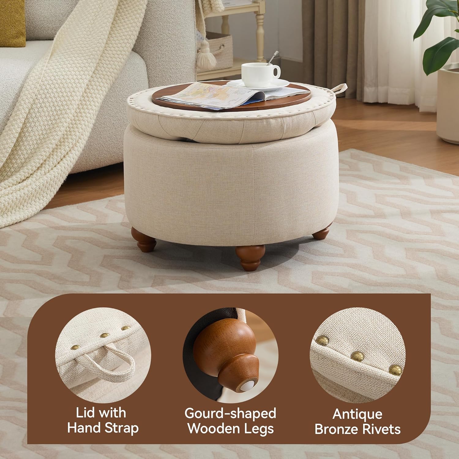 24Inch Round Storage Ottoman with Tray, Modern Tufted Fabric Circle Coffee Table with Storage, Upholstered Ottoman with Removable Top for Living Room, Bedroom, Khaki