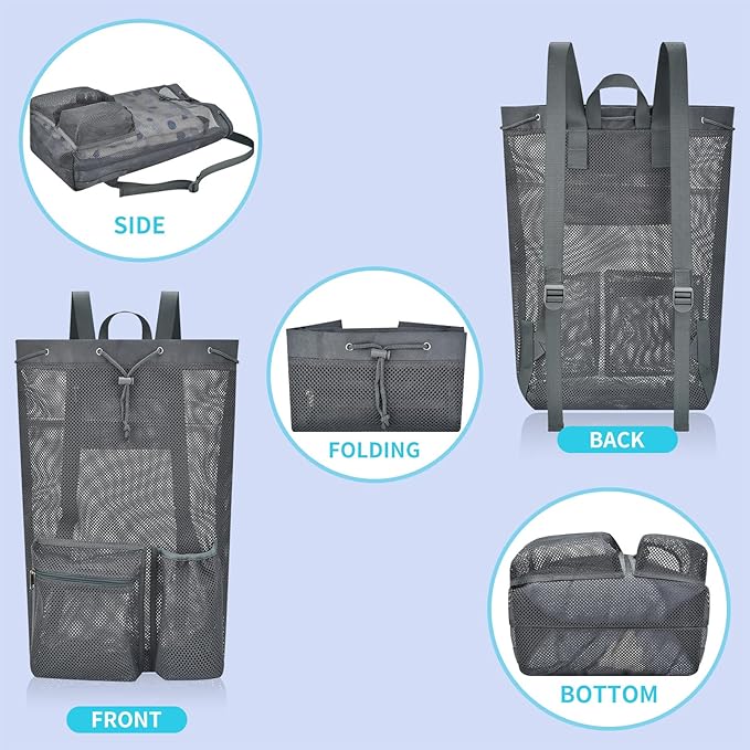 - EASY FOLDING and STORAGE: Our mesh drawstring backpack is easy to fold and takes up very little space, making it perfect for packing in luggage, your pocket, or the glove box of your car.You'll never have to worry about being unprepared for a beach day again if you keep a mesh beach bag handy.