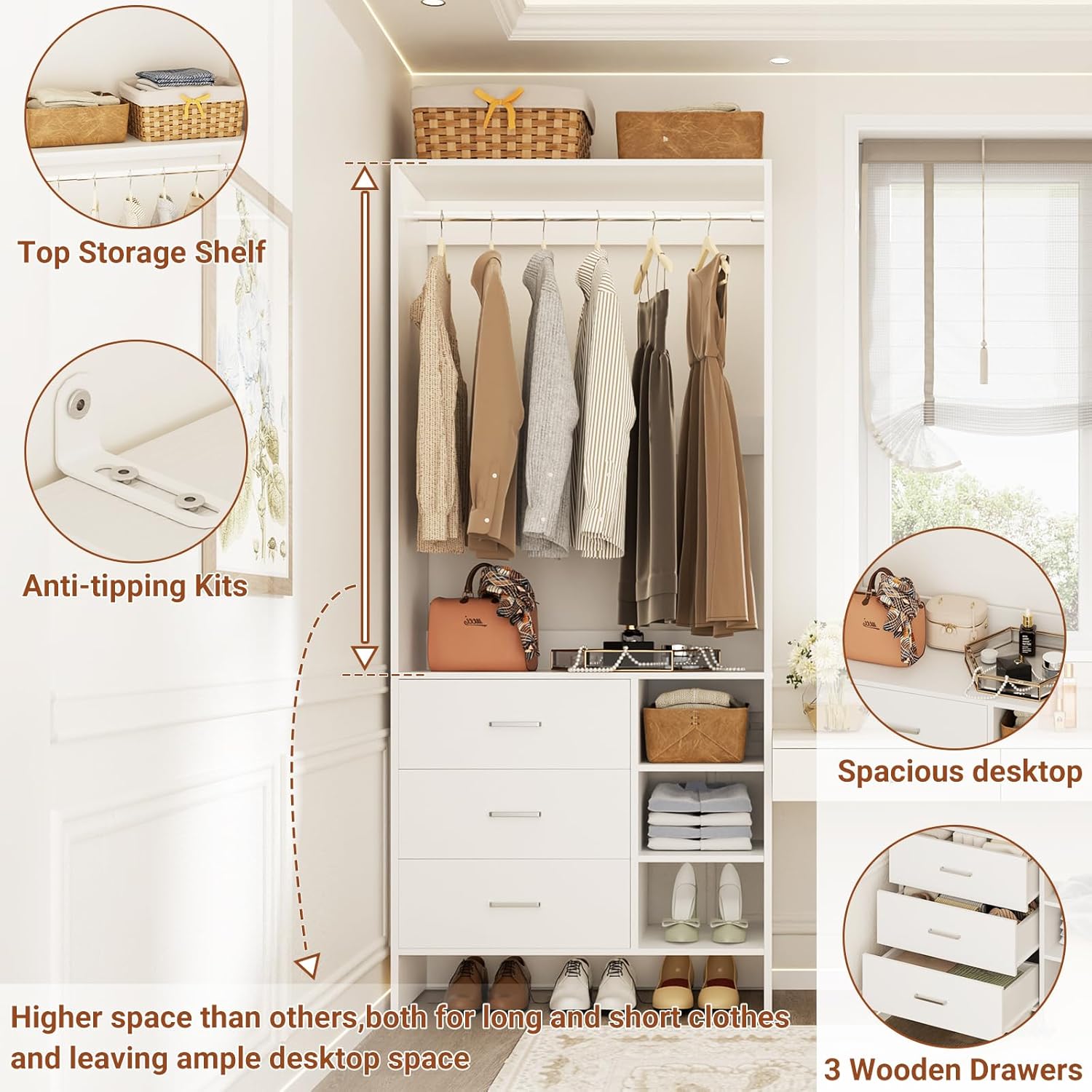Aheaplus 2.5FT Closet System with 3 Drawers, 29.5’’ Closet Organizer, Wood Closet Organizer System, Walk-in Closet or Small Closets Wardrobe, Clothes Rack with Hanging Rods,-E6, White