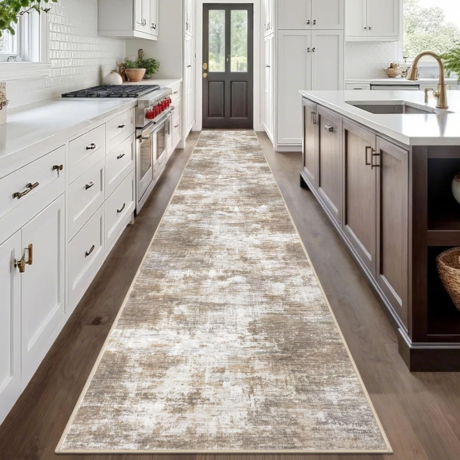 IOHOUZE Abstract Runner Rug 3x20 Ft Extra Long Washable Runners for Hallways, Non Slip Kitchen Runner Printed Faux Wool Entryway Runner Indoor, Modern Abstract Floor Carpet for Hall Stair, Beige Brown