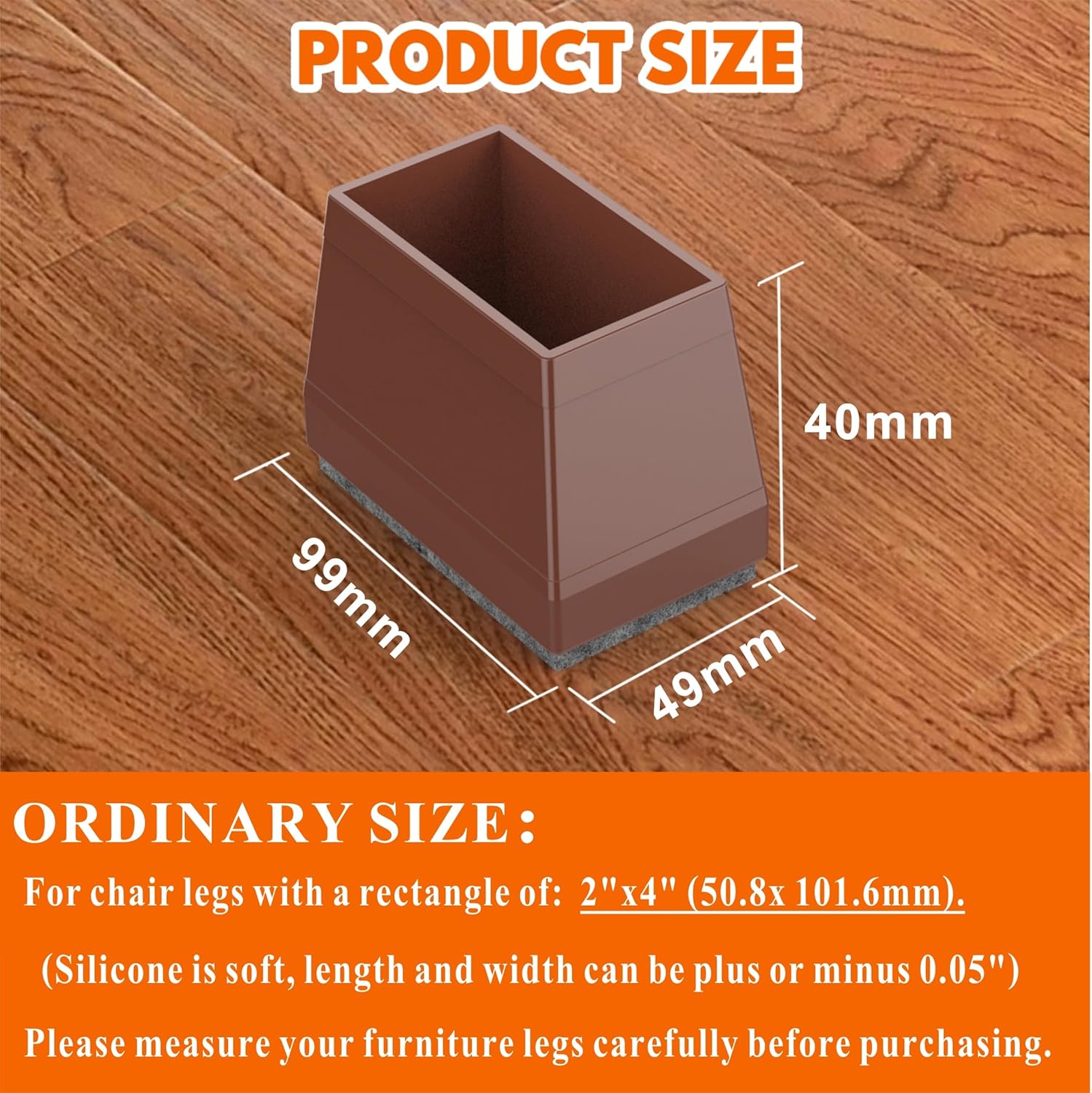 - Universal Fit: Suitable for chair legs with a rectangle of: 2"x4" (50.8 x 101.6mm).(Silicone is soft, length and width can be plus or minus 0.05") Please measure the diameter of your furniture legs before purchasing. Our chair leg caps are suitable for square furniture foot , such as restaurant chairs, bar stools, patio chairs, kitchen chairs, storage cabinet, metal bistro chairs etc.