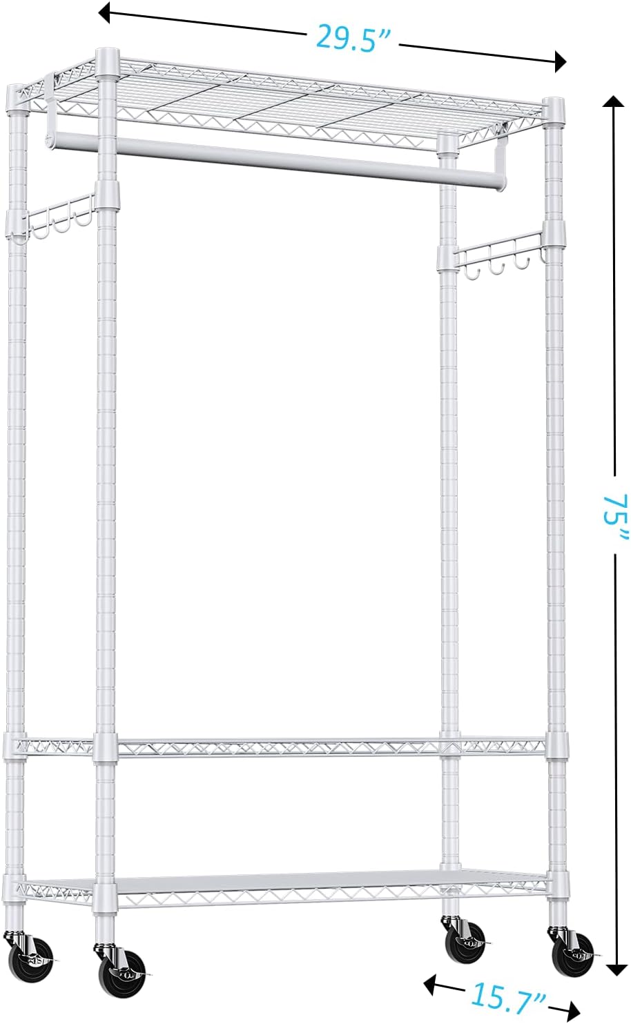 IZEUK Heavy Duty Rolling Garment Rack with 3 Adjustable Wire Shelves, Hanging Rod & Side Hooks - Mobile Clothes Rack with Wheels, 29.5" W x 15.7" D x 75" H, White