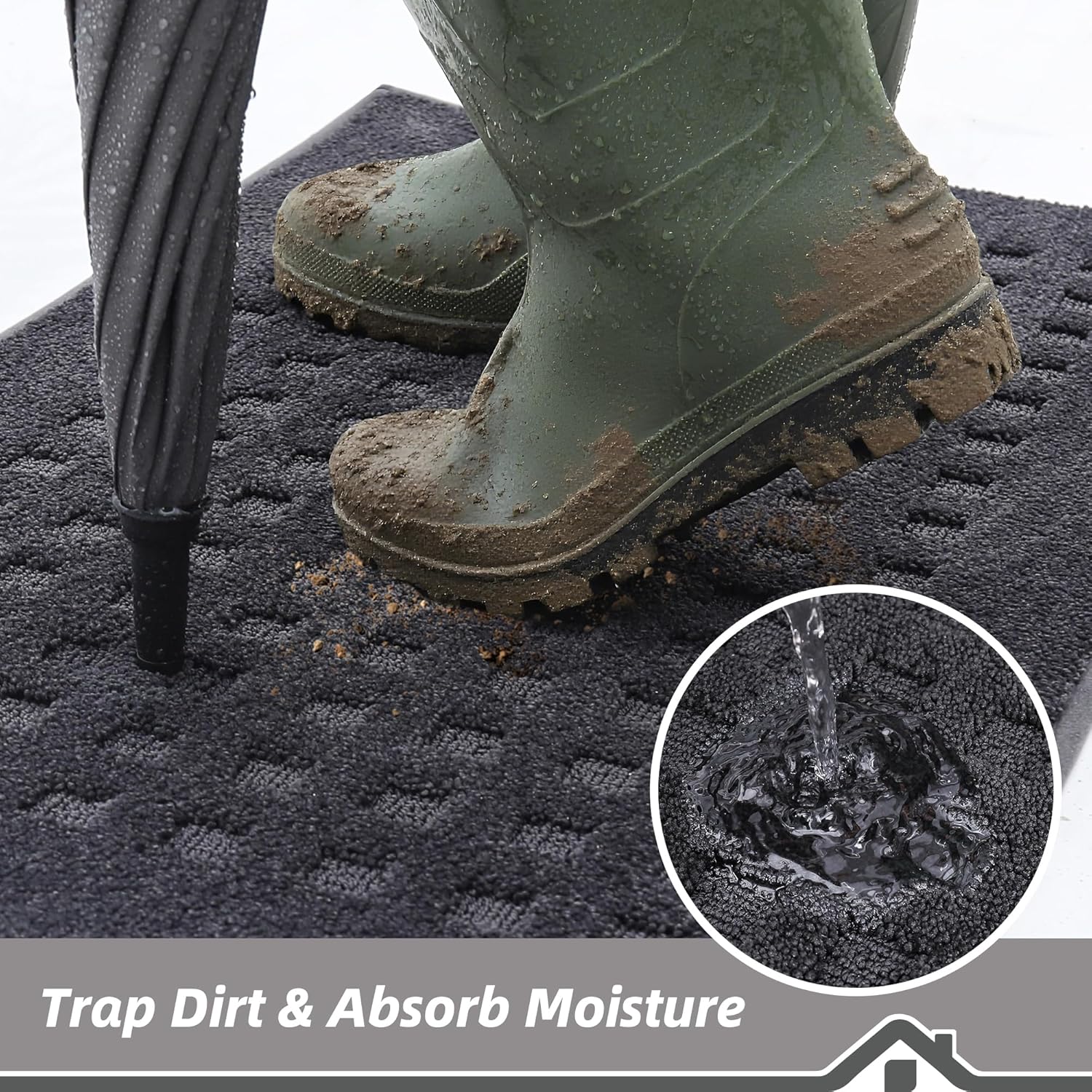 - Trap Dirt and Moisture: Door mats are made of premium Polyester and extremely dense yarns, which are extremely absorbent and stain-resistant. They absorb moisture well and quickly and also scrape dirt off the shoes, keeping the floors clean and dry. Widely used in any weather, especially rainy, snowy or muddy weather. Suitable for front door, back door, entryway, indoor entrance, etc.