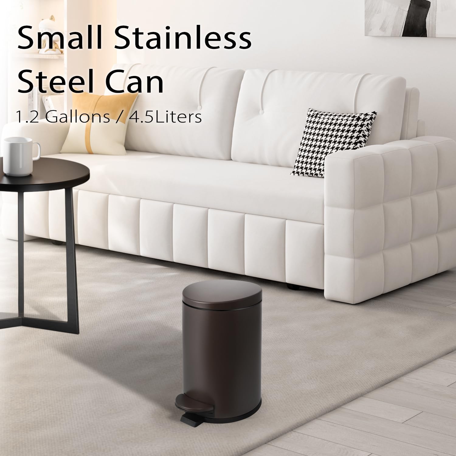 TIPGO Small Trash Can with Lid Soft Close, 4.5 Liters / 1.2 Gallon Bathroom Garbage Can, Mini Step Trash Bin, Stainless Steel Wastebasket for Bathroom, Bedroom, Office (Brown)