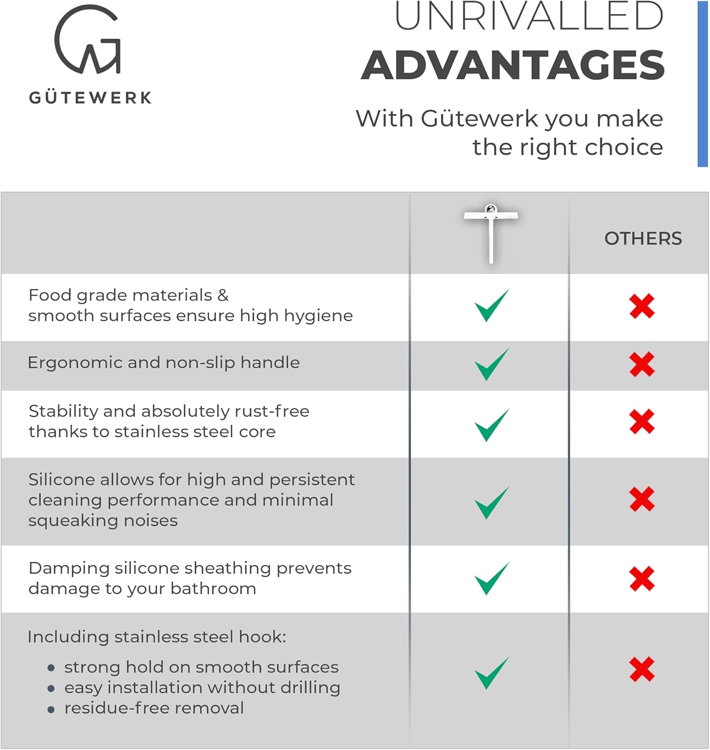 - MINIMALIST TIMELESS DESIGN - The GÜTEWERK glass squeegee is crafted with a matte black finish that impresses with its elegant timeless and smart design. In addition, the chrome-colored stainless-steel hook integrates well with any modern bathroom.