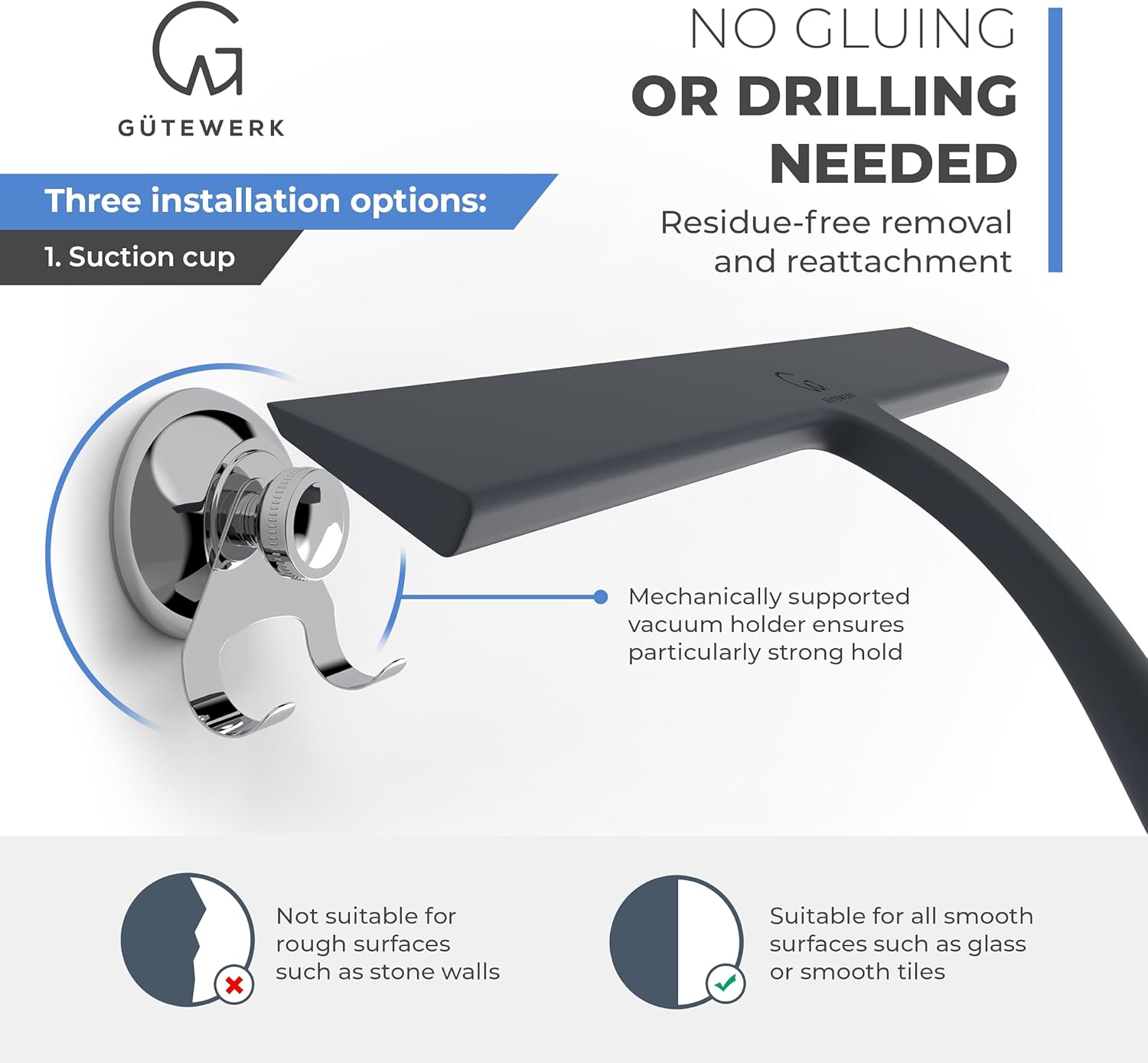 - MINIMALIST TIMELESS DESIGN - The GÜTEWERK glass squeegee is crafted with a matte black finish that impresses with its elegant timeless and smart design. In addition, the chrome-colored stainless-steel hook integrates well with any modern bathroom.