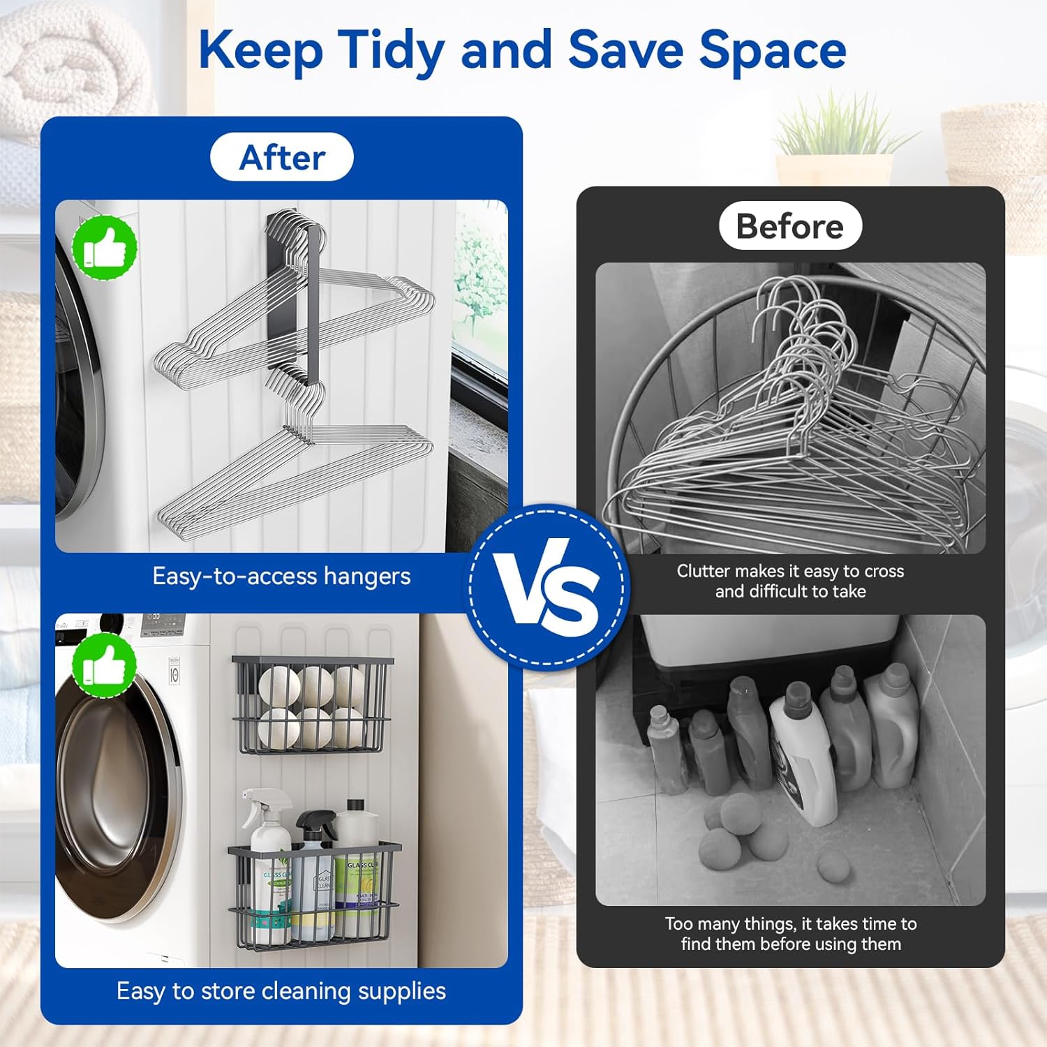 - Maximize Laundry Room Organization and Storage Space: The magnetic dryer ball holder and hanger organizer can be placed on the side or front of the dryer for easy to access and saving space on the laundry countertop. The small space in a small laundry room can also be reasonably utilized, and there will be no more messy placement and scattering.