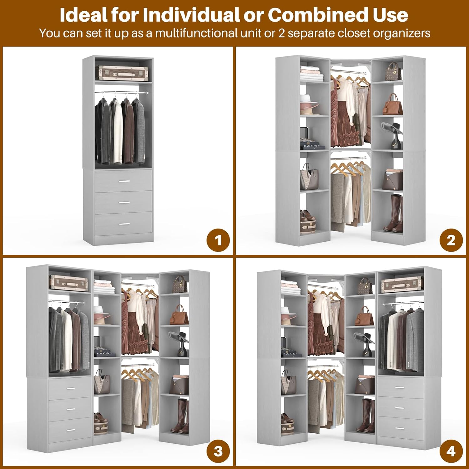 - Versatile Closet System with 2 Sets: This 63.2" large corner closet system is versatile and can be set up as a multi-functional unit or as 2 separate closet systems that can be used for checkrooms, pantries, laundry rooms or food storage, making it suitable for storage in any room throughout your house.