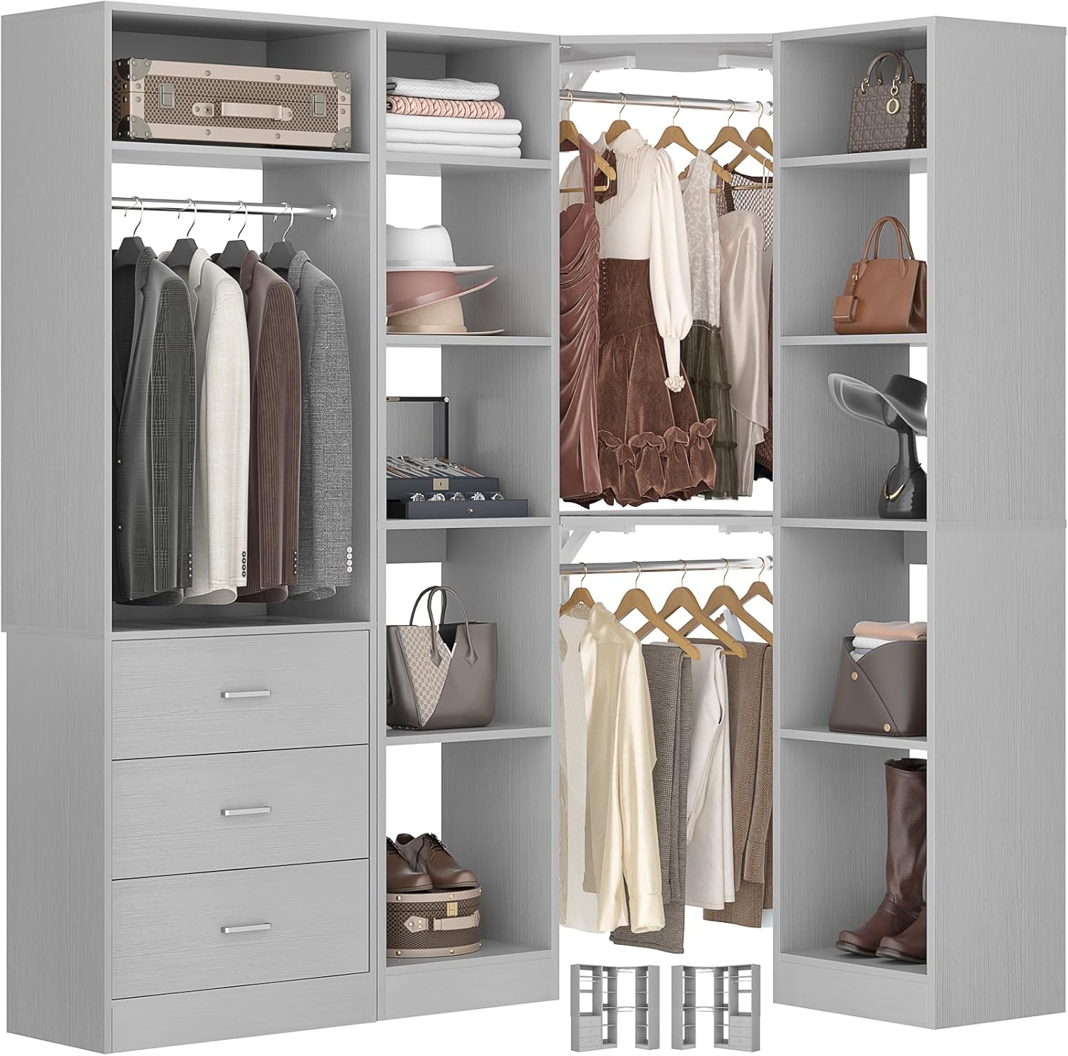 Corner Closet System with 3 Drawers, Corner Closet Organizer System with 13 Shelves & 3 Hanging Rods, 63.2"L * 39.2"W Reversible L Shaped Walk-in Closets, Load 2000+LBS, Grey