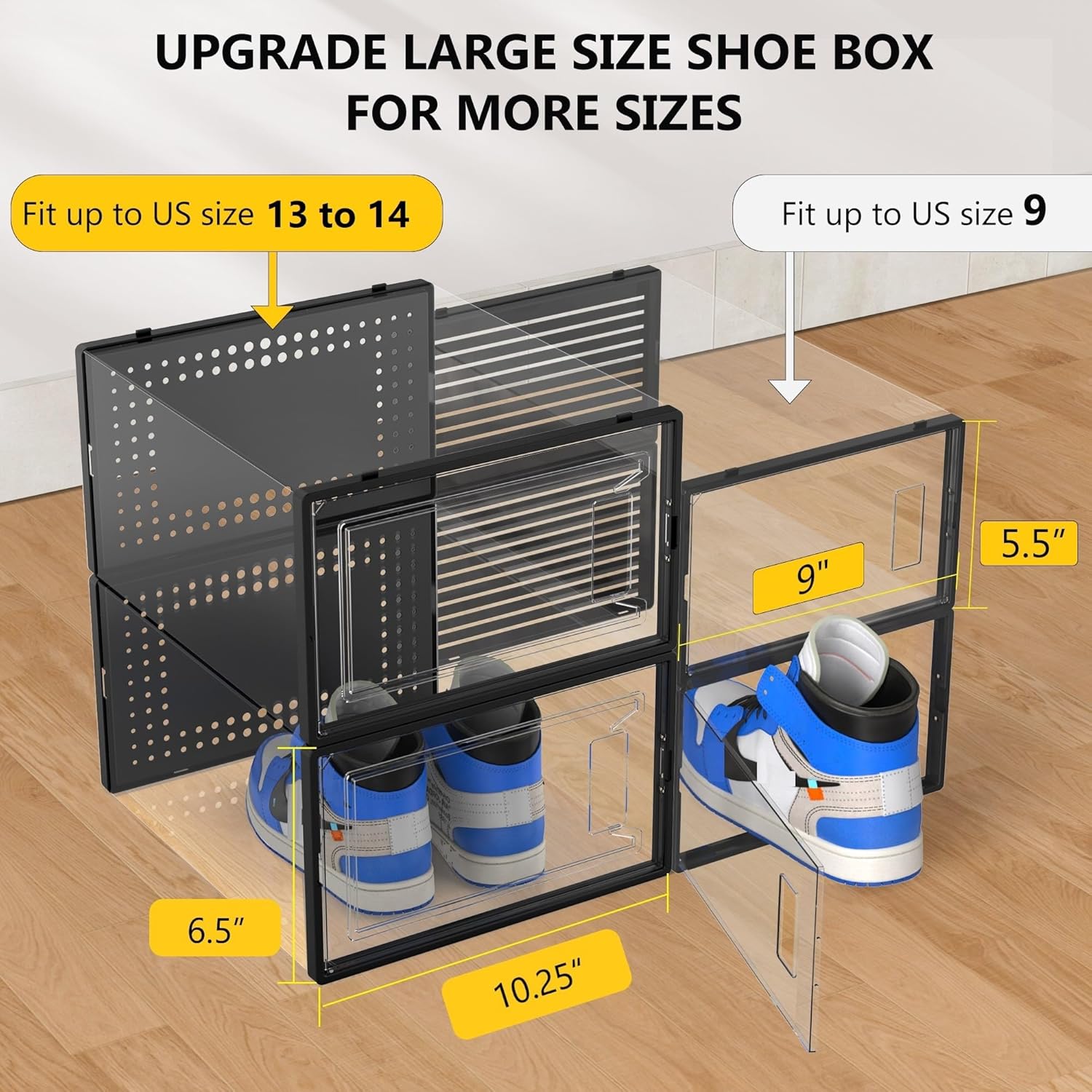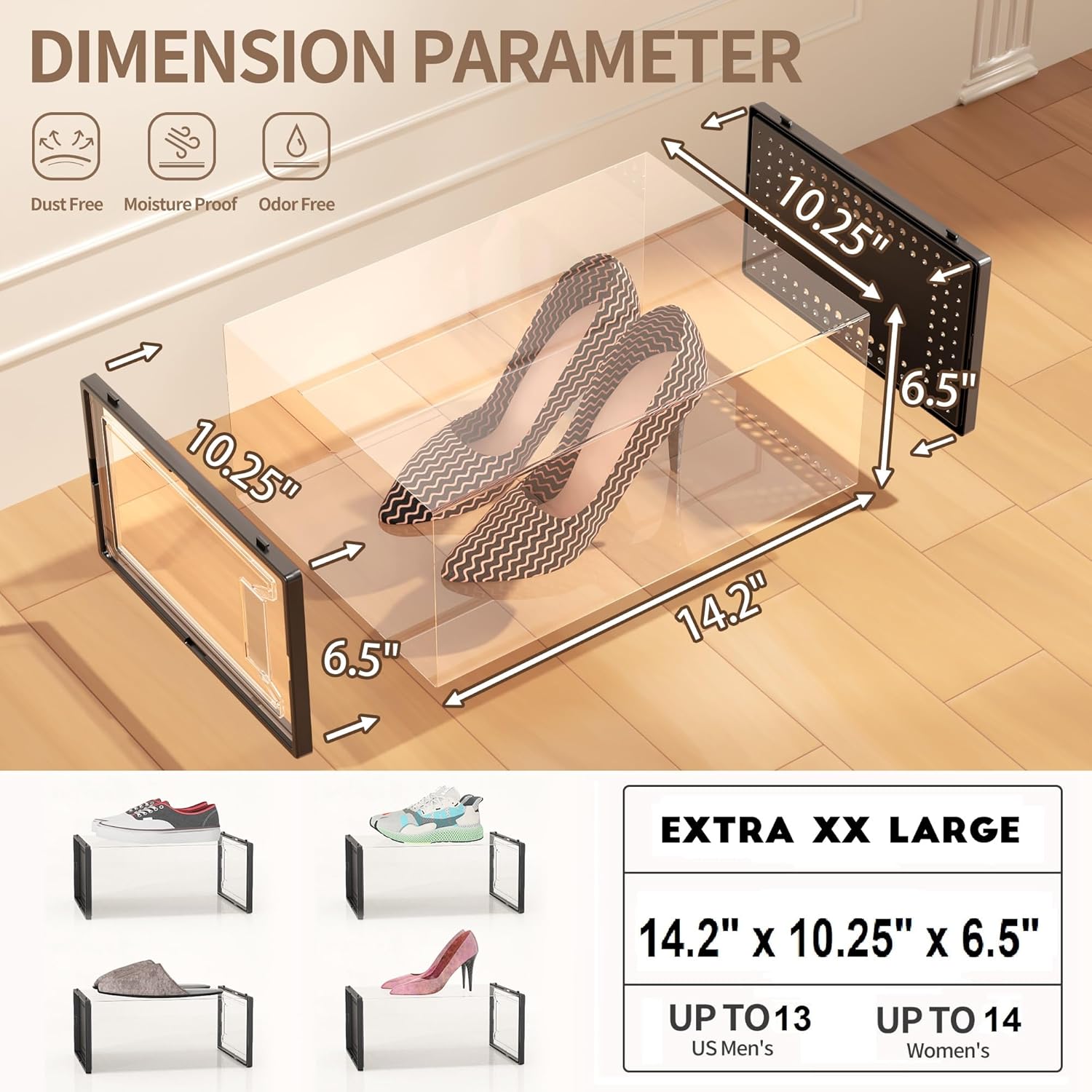 - XXX Large Size Shoe Box: Upgraded wider and higher shoe organizer fit for larger shoes size . Unit size is 14.2"(L) x 10.25"(W) x 6.5"(H), fits for women’s shoes up to US size 14 and men’s shoes up to US size 13. Suitable for many types of shoes such as heels, flats, sneakers, leather shoes, sandals, wedges, and others shoes.