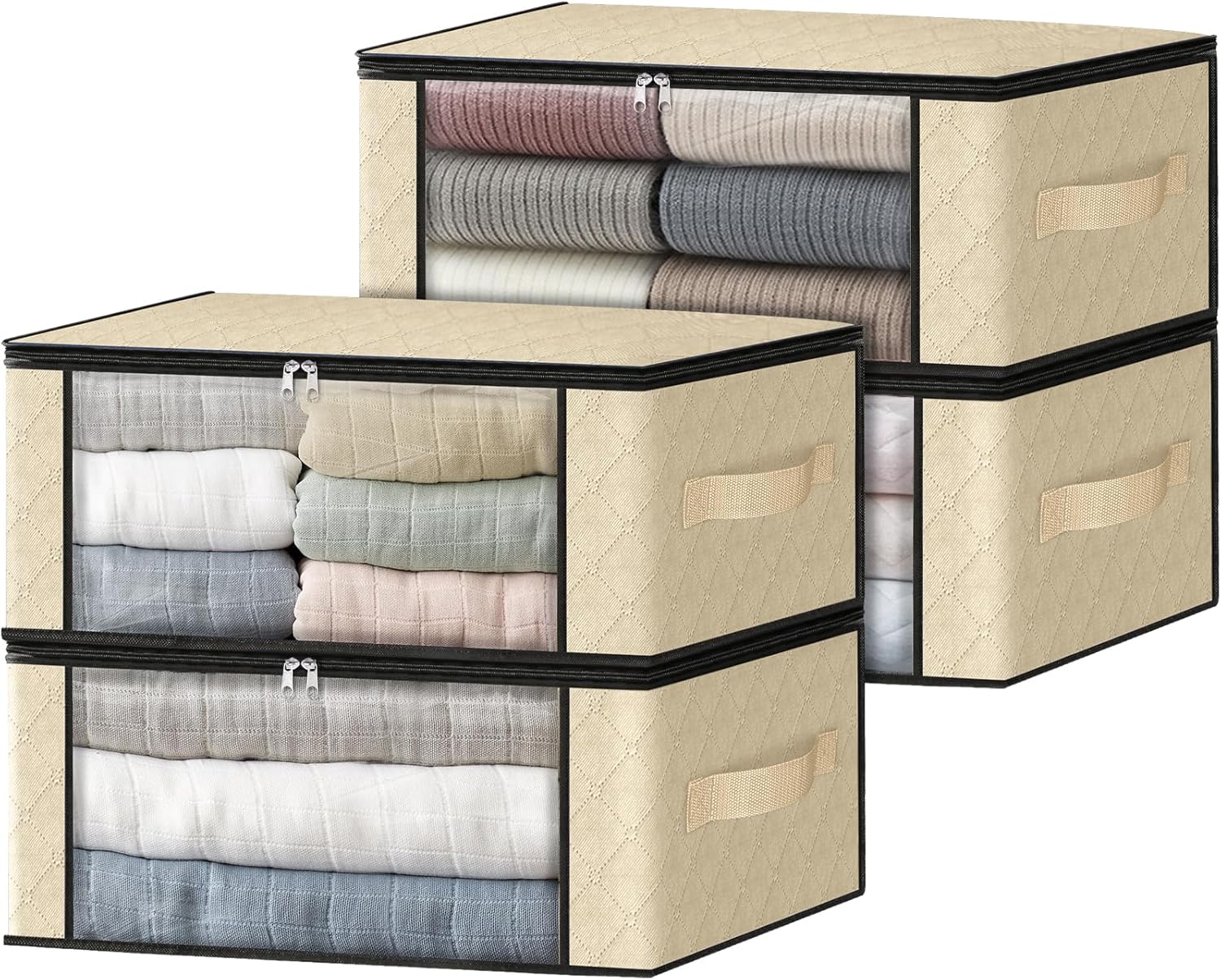 HomeHacks Storage 4-Pack Clothes Organizer Storage Bags Foldable Storage Box with Large Clear Window Sturdy Handles for Closet, Dorm, Pillows, Bedding, Clothes, Blankets, 35L, Beige