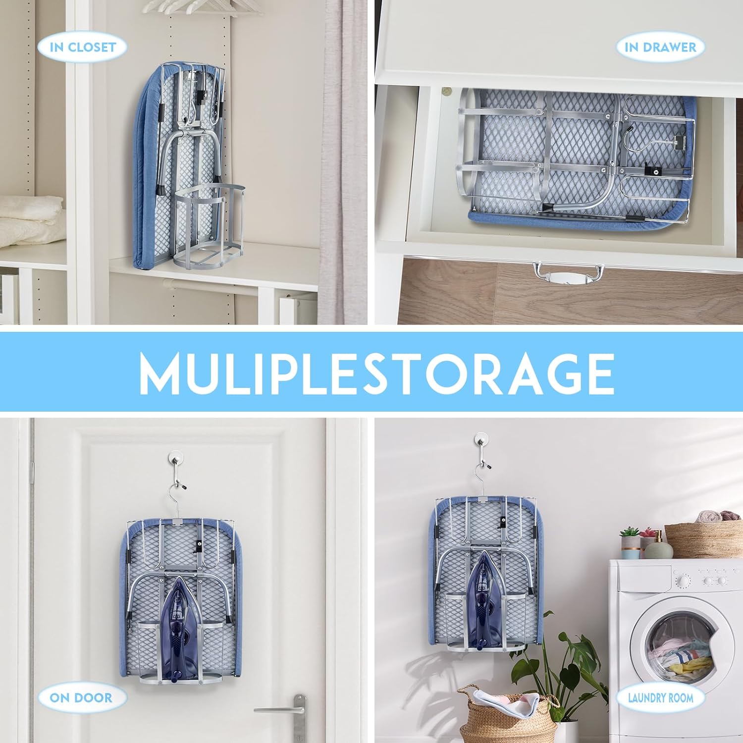 - SPACE SAVING MULTI- Scene Hero- this mini ironing board fits seamlessly into laundry rooms, dorm closets, or luggage. Its ultra-slim profile slides under beds, tucks into cabinets, or hangs vertically with the built-in elastic hook β perfect for apartments, RVs, or hotel stays.