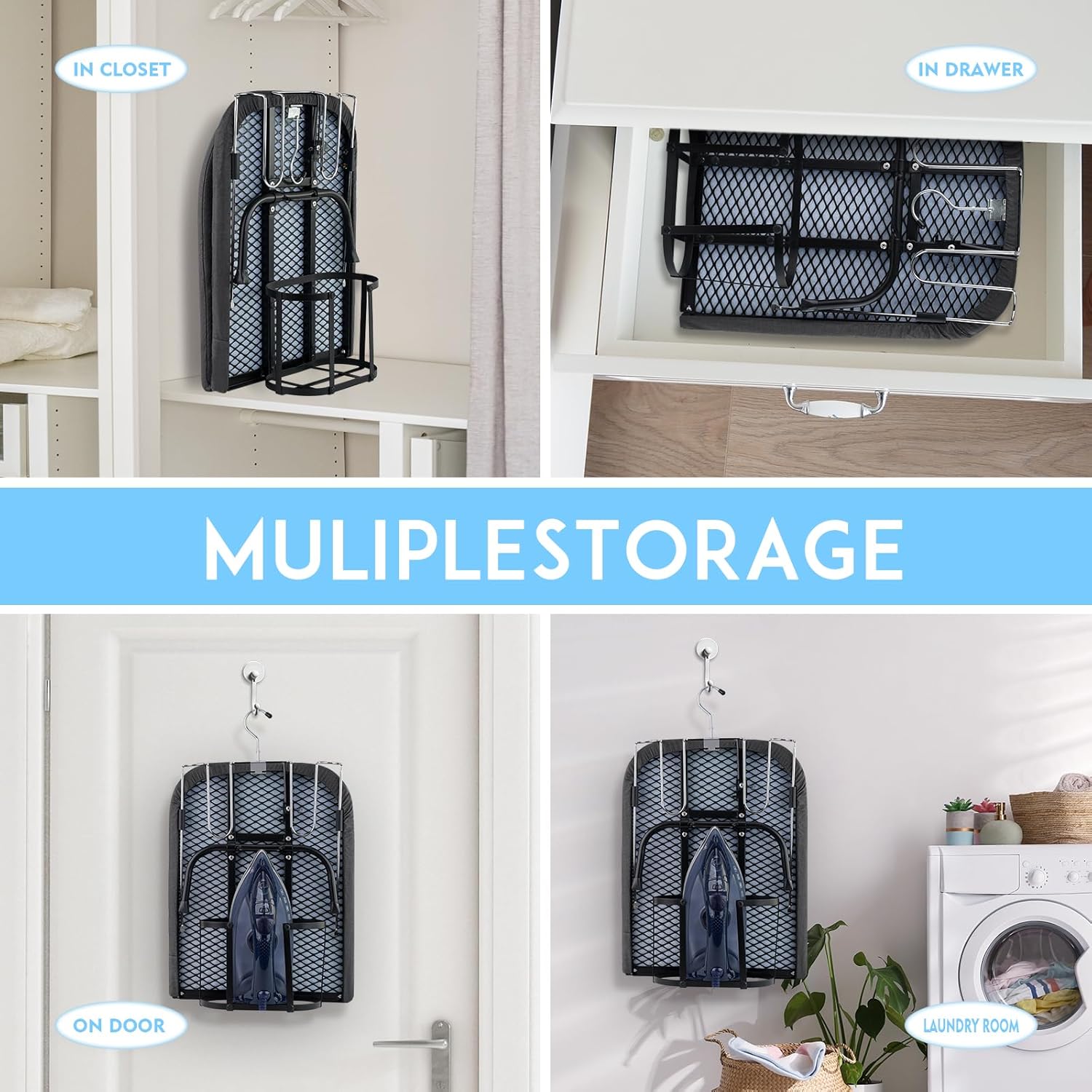 - SPACE SAVING MULTI- Scene Hero- this tabletop ironing board fits seamlessly into laundry rooms, dorm closets, or luggage. Its ultra-slim profile slides under beds, tucks into cabinets, or hangs vertically with the built-in elastic hook β perfect for apartments, RVs, or hotel stays.