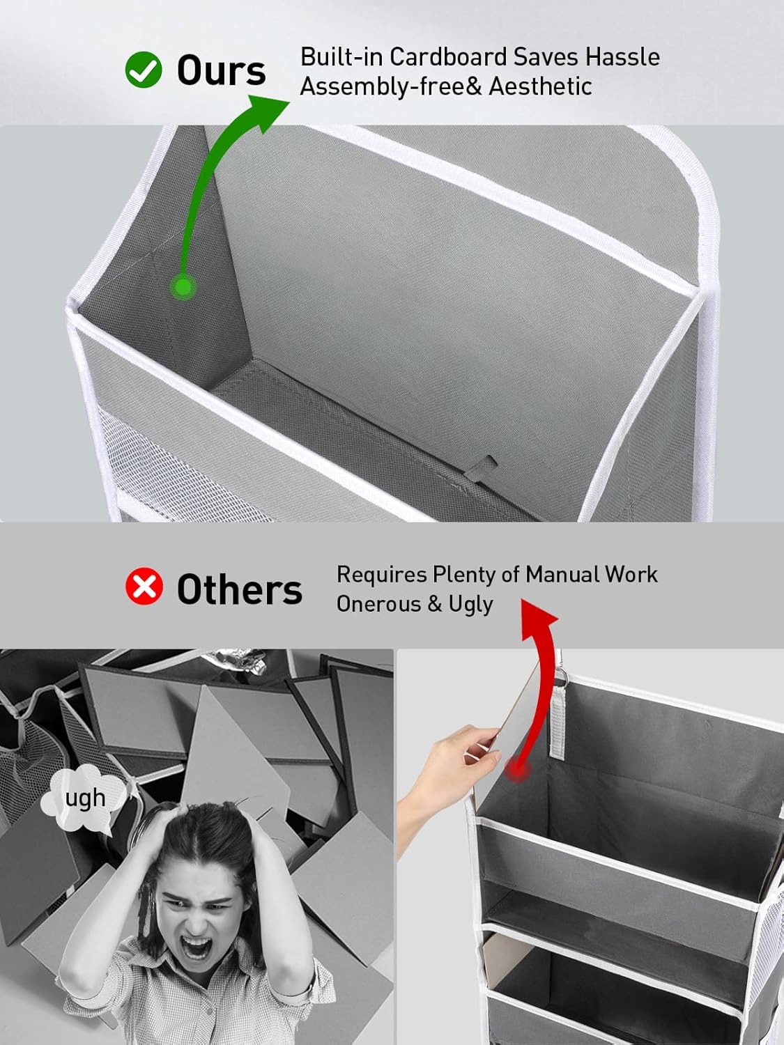 - Tool-free Assembly Within Seconds: No need to insert cardboard in the pockets as required by other bathroom storage shelves! We have it pre-inserted in the pockets to cut your hassle. Simply hang, put the cardboard in the bin's bottom, and done! Definitely a good pickup for anyone on a budget wanting to update organization and storage for extra storage.