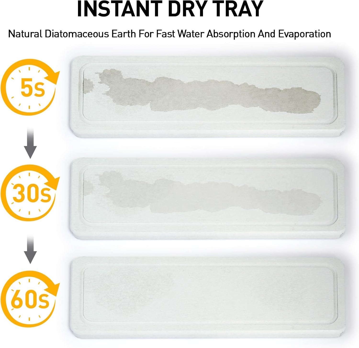 - 【QUICK DRY TRAY】Moforoco's soap dispenser set uses a new material, diatomaceous earth. Experiments have shown that diatomaceous earth has stronger water absorption, is environmentally friendly and safe, and has the characteristics of quick drying. It is very suitable for use around the sink and sink, so that the kitchen sink is always dry.