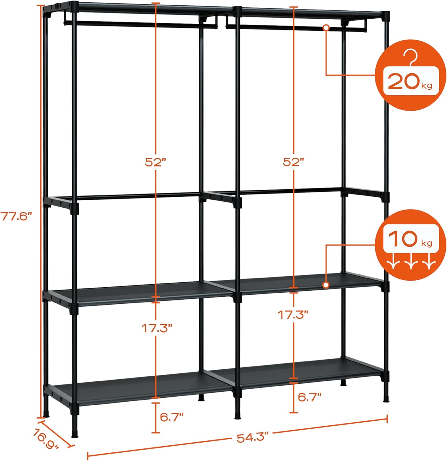 - [Stable and Strong] Featuring with steel tubing, high quality non-woven fabric and durable connectors, this wardrobe ensures long-lasting stability and support. Each hanging rod holds 44 lb and Each shelf holds up to 22 lb.