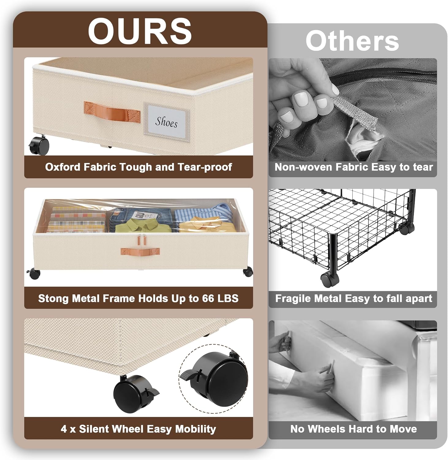 - 【360° Rotating Slide Wheels】Mobile storage no stress. Under Bed Storage Containers is equipped with 3 X side handle and 4 x 360°rotating wheels, that glide effortlessly on various surfaces. There is no sound when sliding, Beborxue Underbed storage baskets are ideal for bedrooms, living rooms, dorms, shoe cabinets, attics, basements and other places to use.