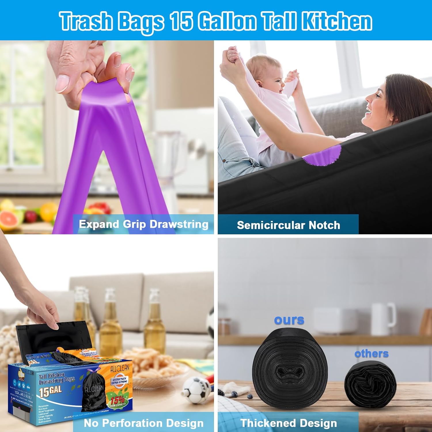 - [Multi-Use&Occasions]: Our kitchen drawstring large trash bags have a 15% increase in capacity compared to the traditional 13-gallon kitchen garbage bags, Perfect for big size and any shape all brands of 10-15 gallon trash cans on the market. It can be used for kitchen, offices, living room, bedroom, backyard, hotel trash, camping, even storage bags etc. Heavy duty garbage bags are easy to open, tear apart, and put into trash containers, which can reduce the frequency of taking out the trash.