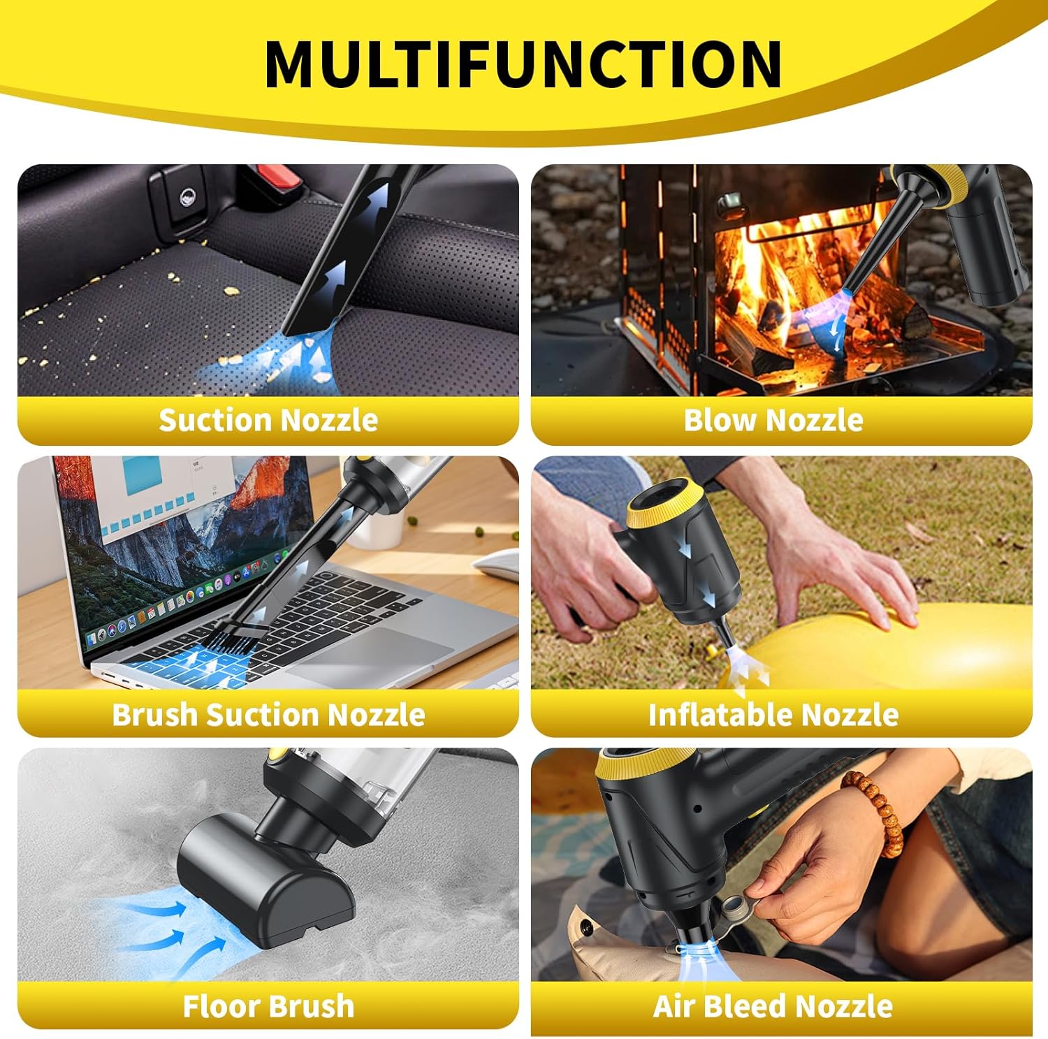 - 4-in-1 Multifunctional Design β Effortlessly switch between blowing dust, vacuuming debris, deep-cleaning with vacuum suction, and inflating items like air mattresses or sports balls. Perfect for cars, homes, garages, camping, and outdoor adventures.