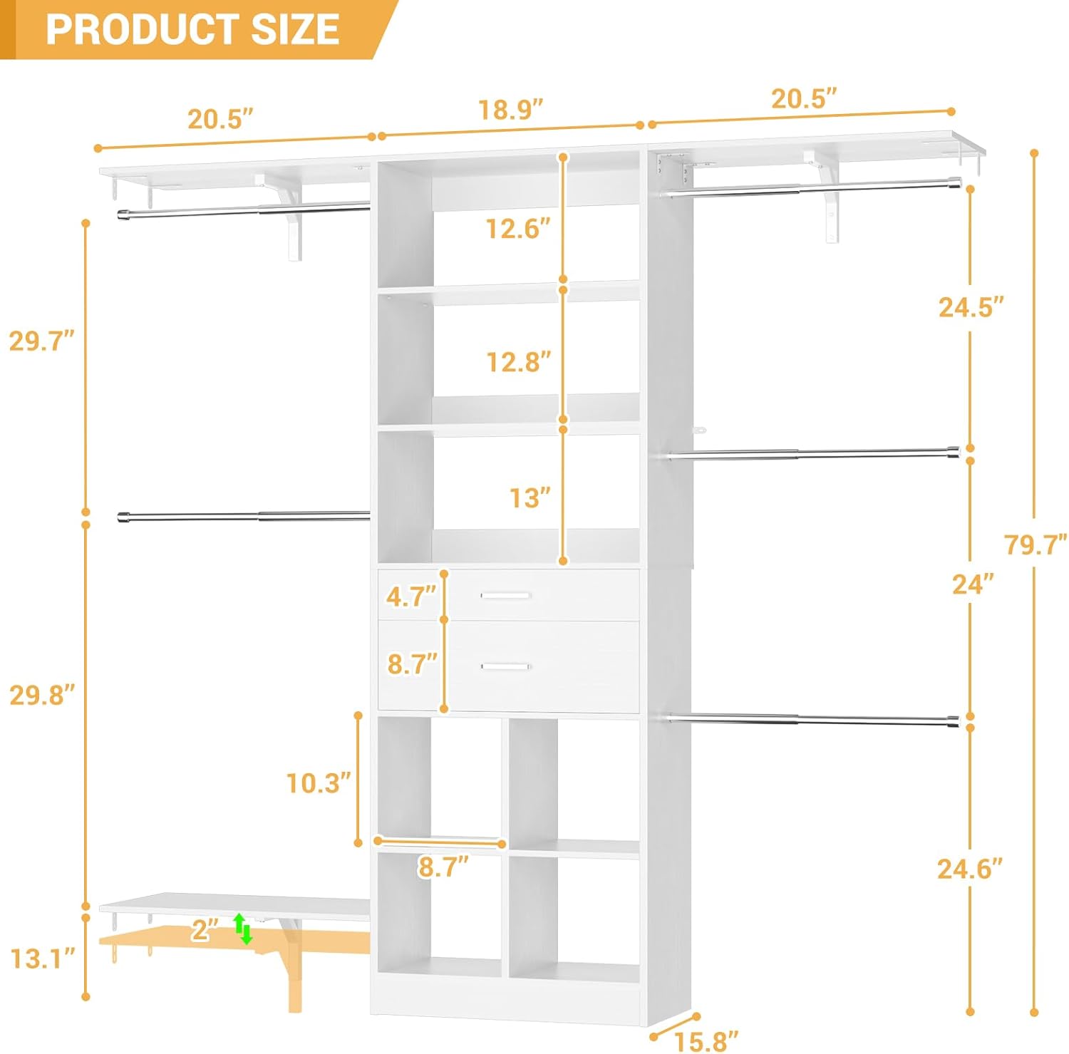 - Considerate Details - Featuring a special shallow drawer, it is easy to take or place your small items. Besides, the extra shelving and hanging robs are reversible. So you can set all the closet systems for your walk-in closet based on your usage habits.