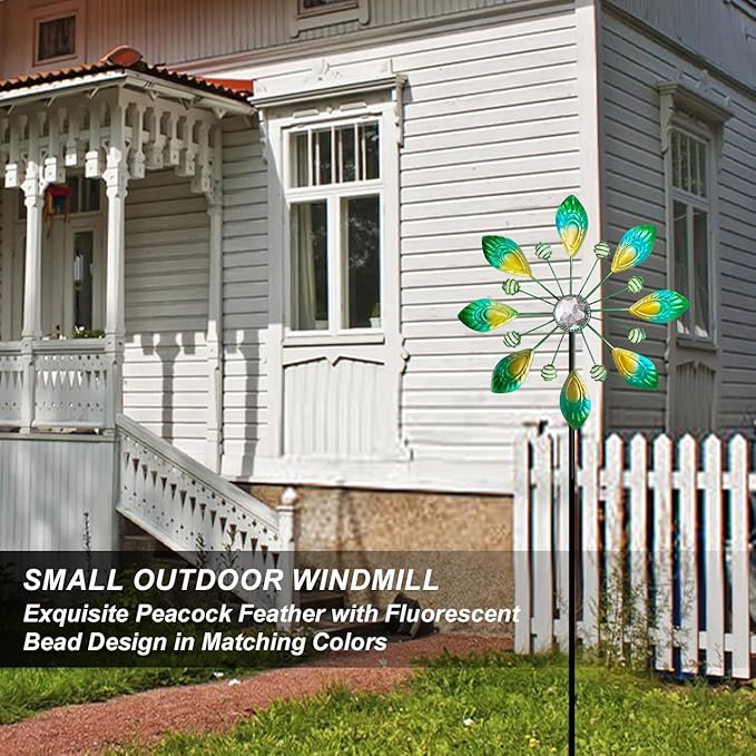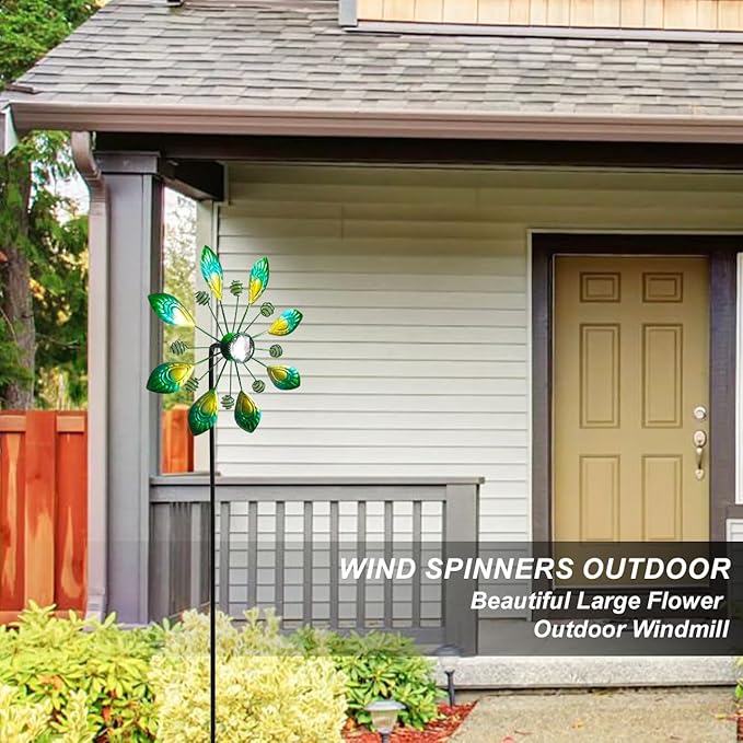 - SENFLAME Metal Green Peacock Wind Spinner for Outdoor DecorCrafted with metal green peacockfeather detailing, this outdoor wind spinnertransforms gardens into mesmerizing kinetic art displays.The 36"H vertical design with 10"W rotating base creates dynamic shadow patterns that dance across lawns, while weather-resistant powder coating ensures year-round vibrancy in rain or shine. Includes metal stake for secure ground mounting in windy conditions
