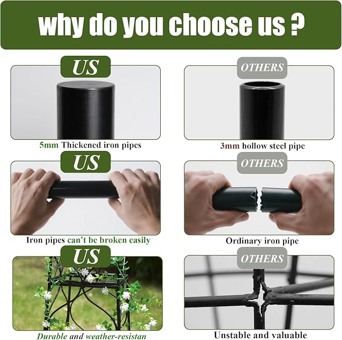 - Superior Metal Construction: Constructed from high-quality metal with a timeless black finish, this garden trellis not only exudes elegance but also offers unmatched durability and strength, ensuring it withstands the elements for all your outdoor gardening endeavors.
