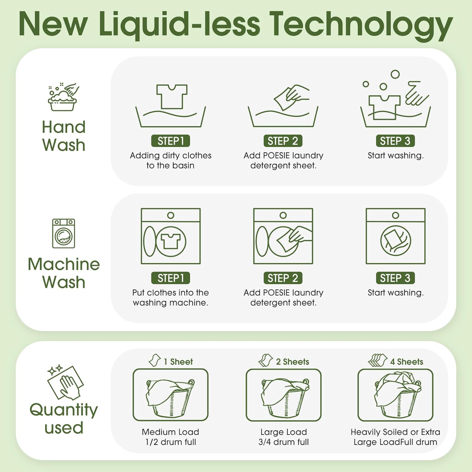 - Easy to Use - Liquidless detergent sheets, 1 sheet for small or medium loads where clothes are not very dirty, 2 sheets for large loads and 4 sheets for extra large loads, no waste. Not too little and not too much to save resources