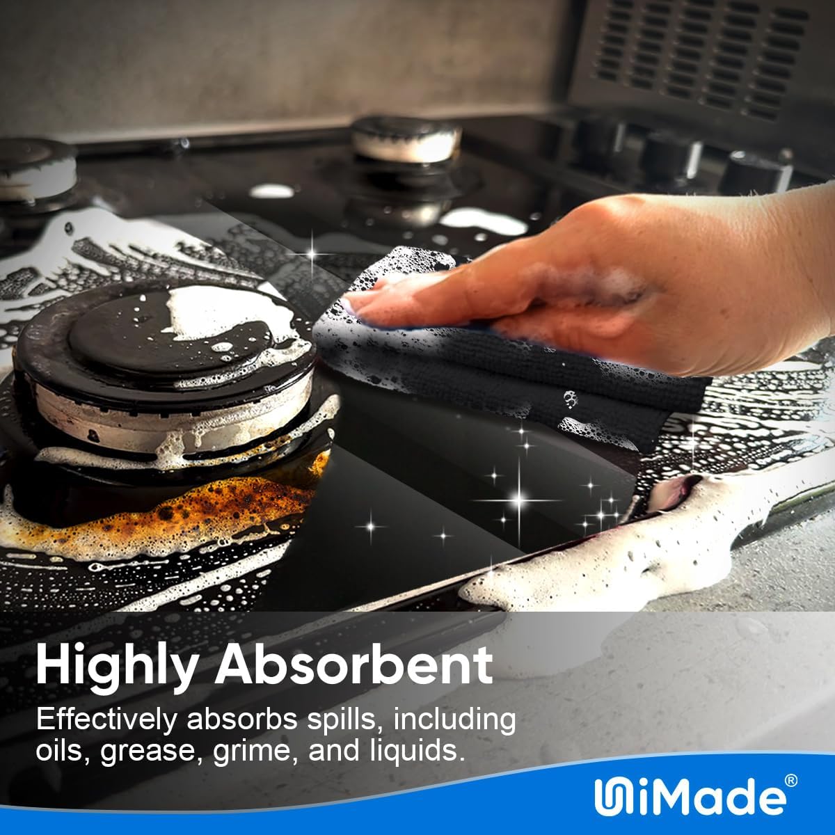 - Powerful Cleaning: Unimade commercial grade microfiber cleaning cloths boast exceptional cleaning power, tackling messes with ease. From spills to stains, they deliver a thorough clean every time. Say goodbye to stubborn stains and spills with our shop towels